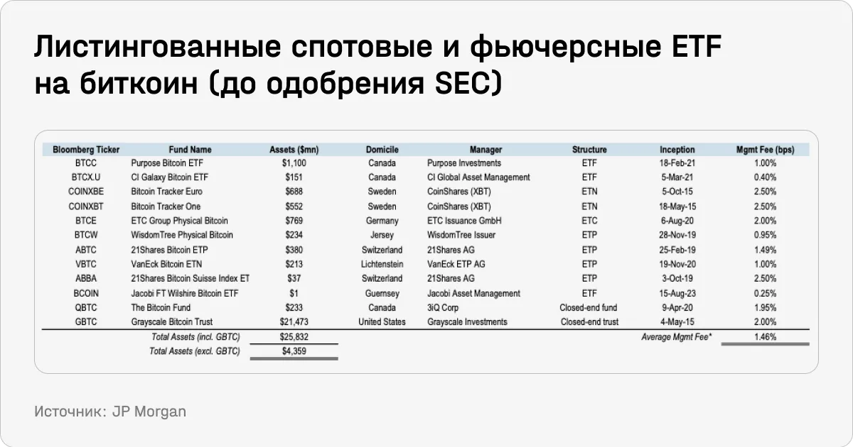 Остальной объем биткоинов уже занят либо торгующимися за пределами США спотовыми биткоин-ETF, либо фьючерсными биткоин-ETF. Крупнейший из последних, Grayscale Bitcoin Trust, с активами больше чем на $21 млрд уже конвертирован в спотовый. Остальной приток, по прогнозу JP Morgan, придется на новых инвесторов.