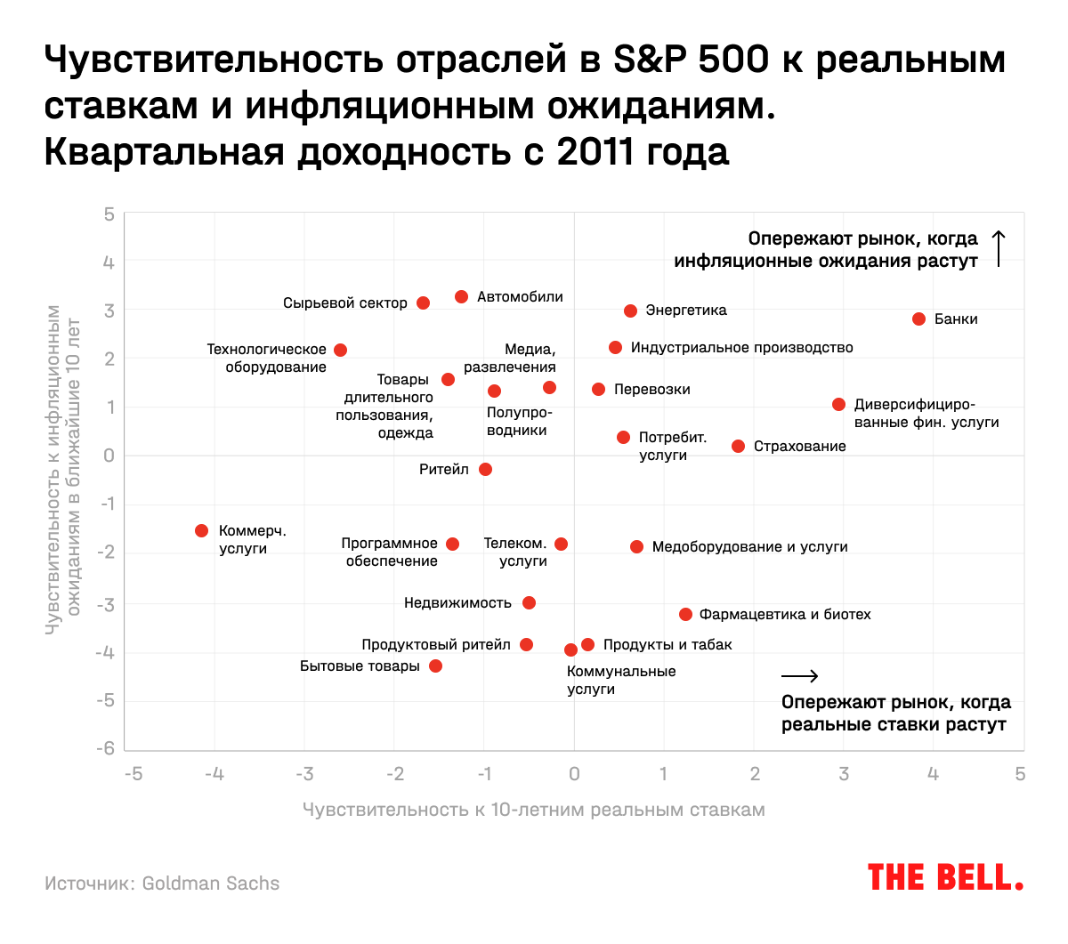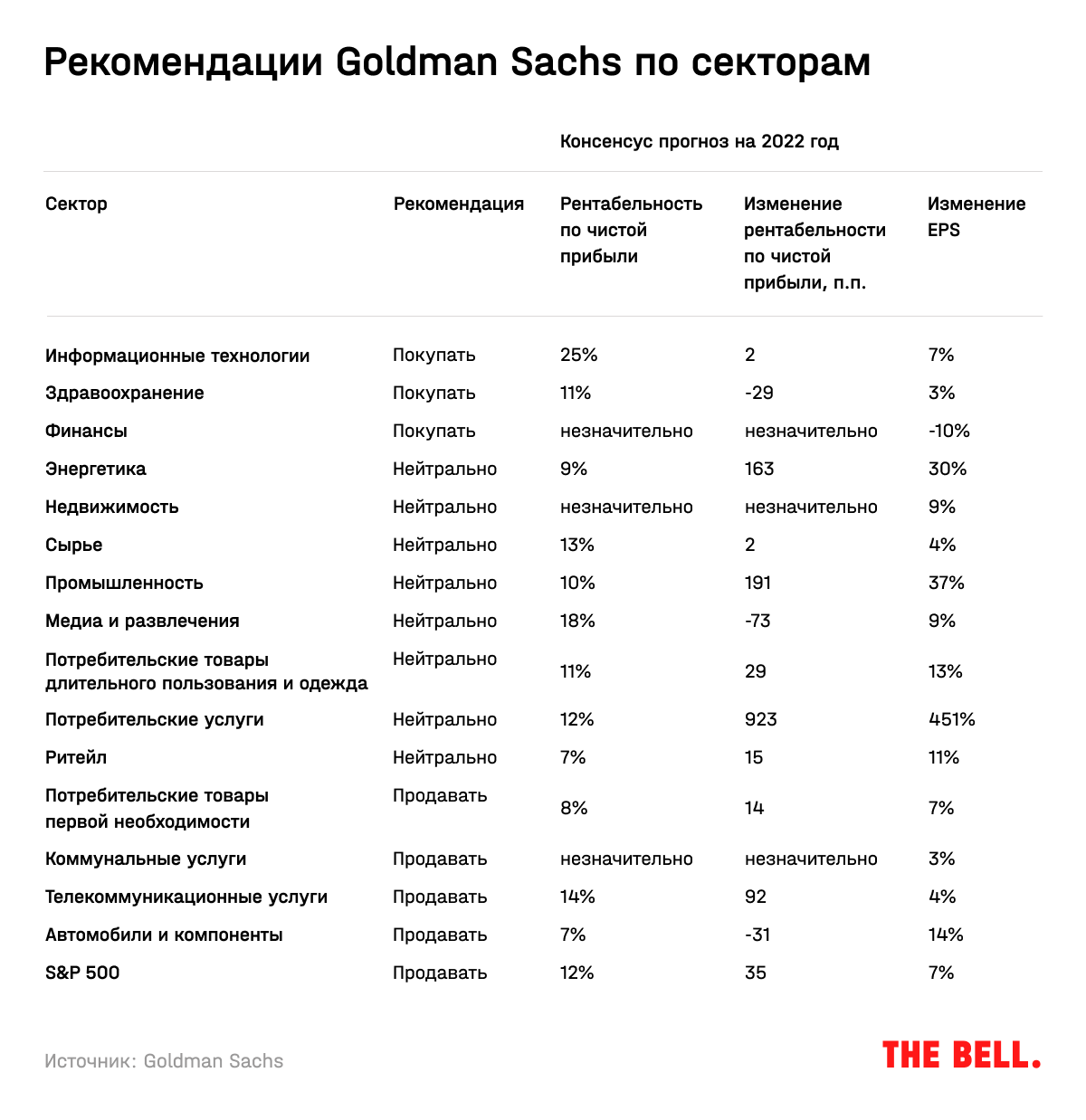 • Рекомендация Goldman Sachs по сырьевому и энергетическому секторам, а также по секторам недвижимости, промышленности, медиа и развлечений — «держать». Циклические секторы, в том числе сырьевой и энергетический, выигрывают от роста экономики, но во втором полугодии рост замедлится, а рост ставок для них — негатив. По прогнозу инвестбанка, цены на нефть достигнут максимума в начале следующего года, а затем в течение 6 месяцев останутся на том же уровне.