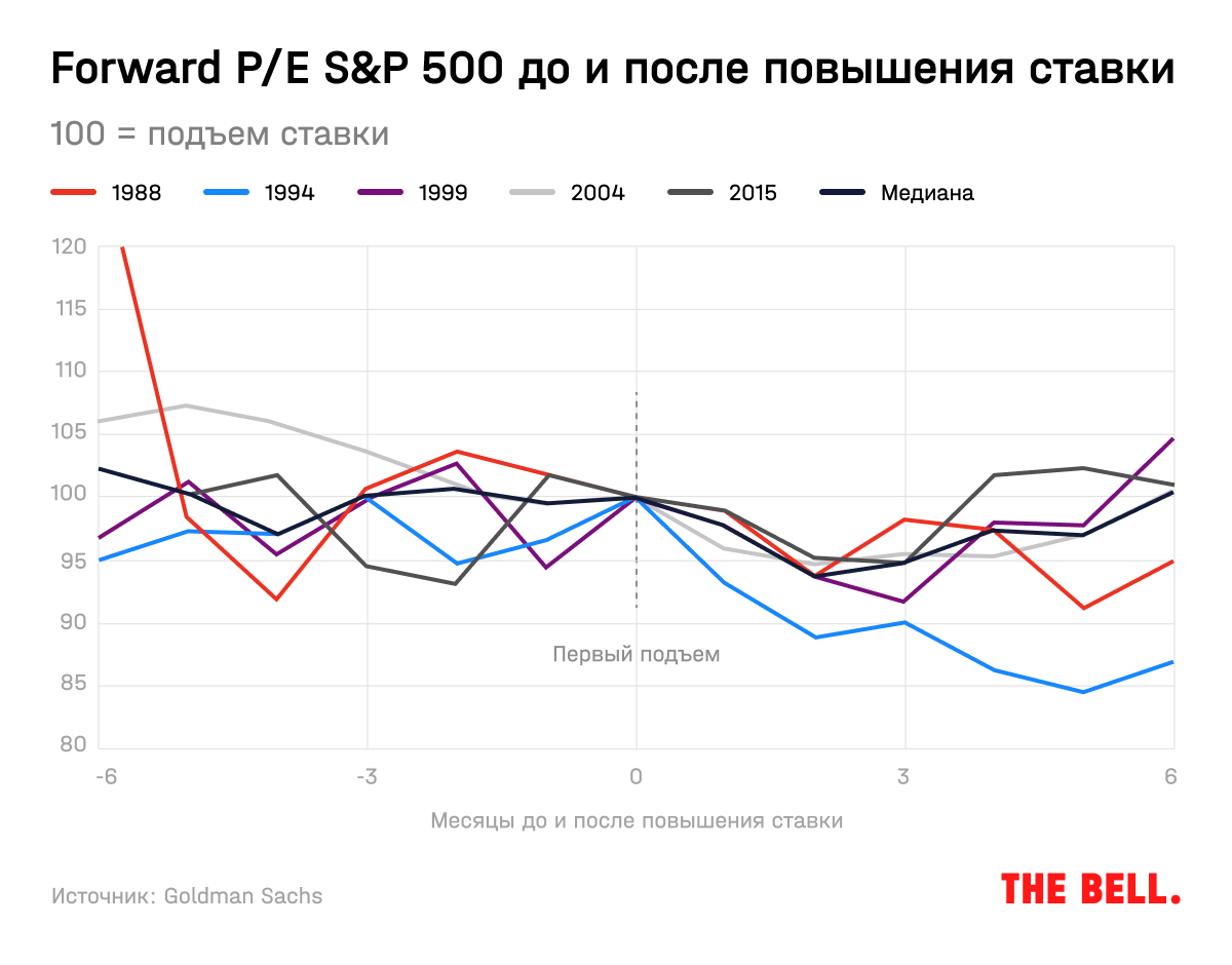 По прогнозу, ФРС завершит программы выкупа активов в июне следующего года, а в июле поднимет ставку на 25 базисных пунктов (б.п.). Второе повышение с таким же шагом произойдет в четвертом квартале. Затем ФРС продолжит повышать ставки два раза в год на 25 б.п. Как показывает исторический опыт, последние пять циклов повышения ставки оценка рынков по показателю прибыль/цена в ближайший год оставалась неизменной в течение полугода до и после первого повышения.
