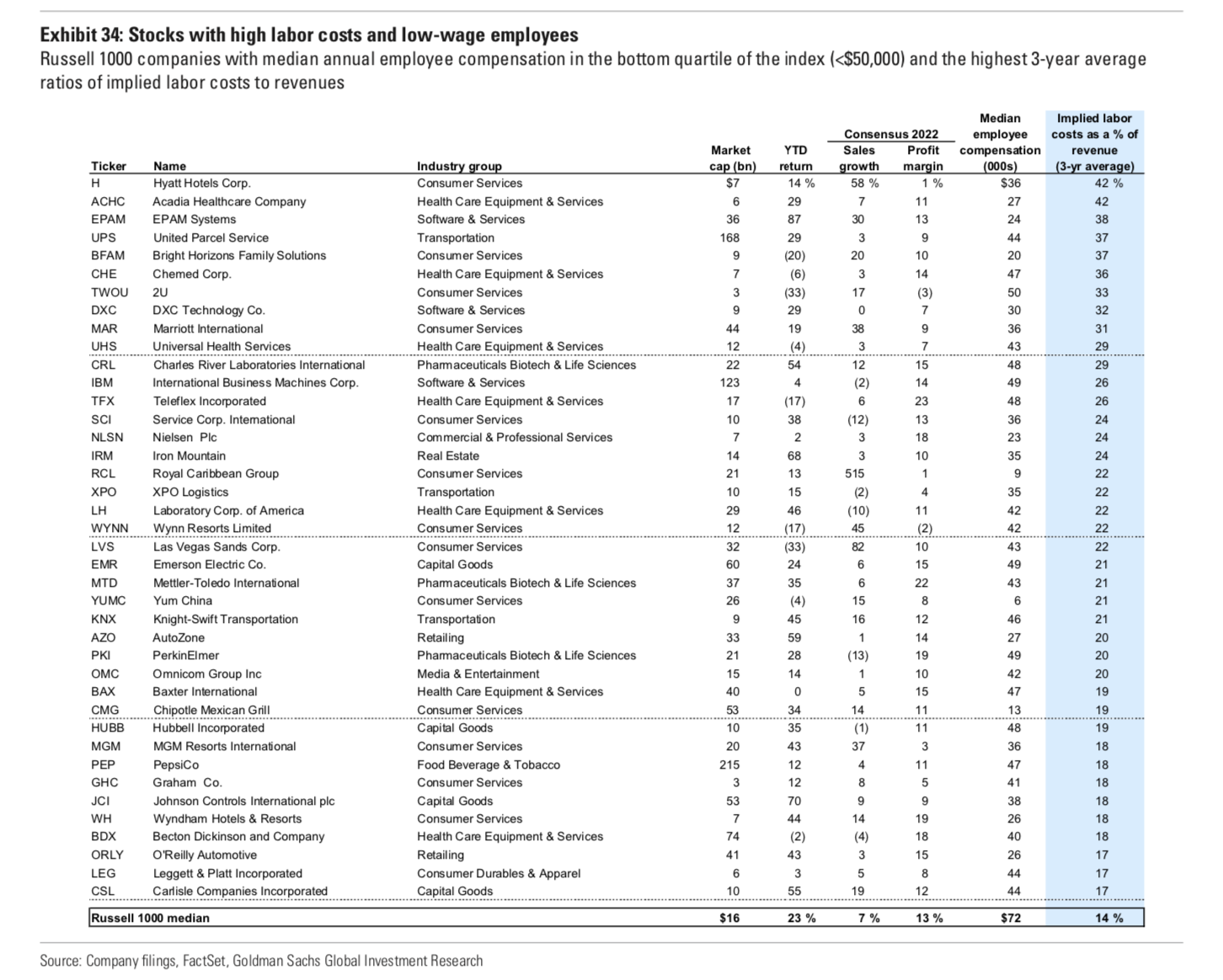 2. Избегайте компаний с высокими затратами на рабочую силу. Сейчас происходит самый сильный рост зарплат за последние 20 лет, поэтому акции компаний, уязвимых к росту затрат на оплату труда, останутся под давлением в ближайшие годы. К примеру, в сфере гостеприимства и развлечений акции компаний с низкими затратами на рабочую силу на протяжении большей части года показывали лучший результат, чем аналогичные компании с более высокими затратами.