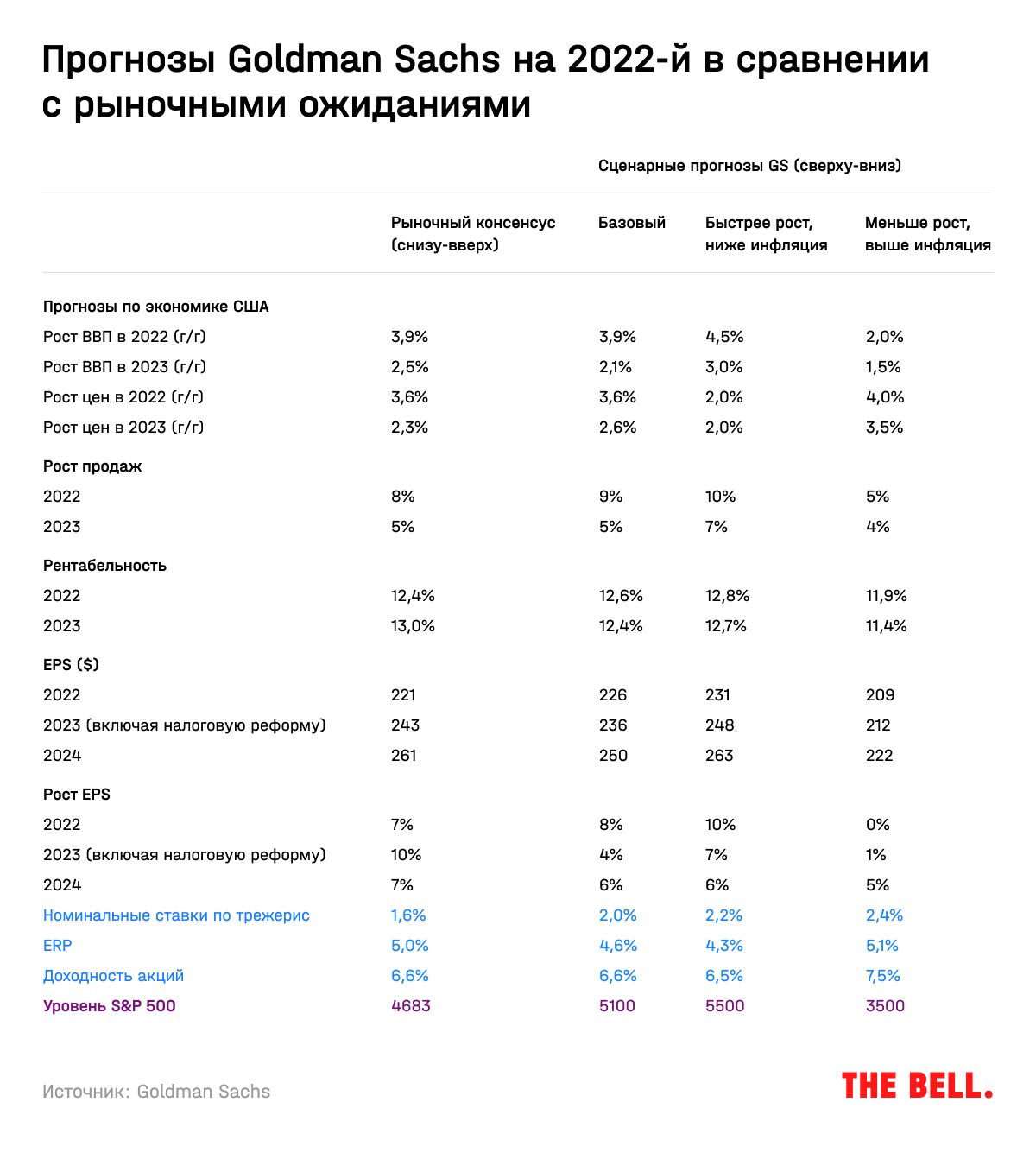 Согласно базовому сценарию, S&P 500 в 2022 году вырастет всего на 9%, до 5100 пунктов, с учетом дивидендов — на 10%. Для сравнения, с начала этого года индекс уже вырос на 27%, а с марта 2020-го — в два раза. Замедление экономического роста, ужесточение политики ФРС и рост реальных ставок — факторы в пользу того, что инвесторам не стоит ждать такого же быстрого роста.