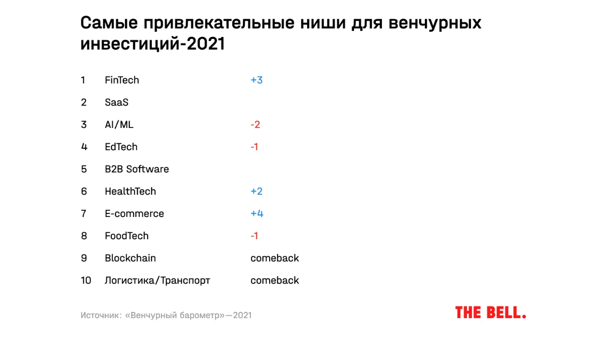 Согласно итогам «Барометра», среди самых востребованных венчурными инвесторами ниш с 2014 года укрепляется FinTech. Также в топ привлекательных направлений регулярно попадает искусственный интеллект и машинное обучение (AI/ML), что неудивительно — этот технологический компонент «зашит» уже в трети всех ИТ-стартапов.
