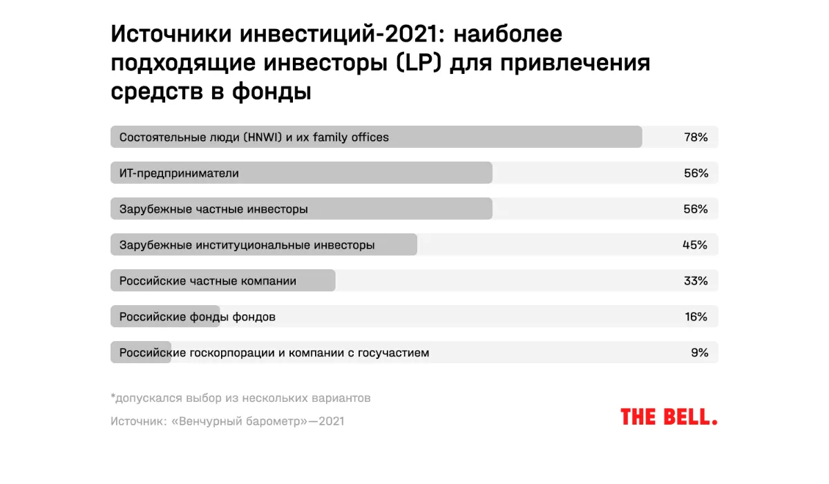 С 2017 года рынок уповает на «хайнетов» (HNWI) — большинство респондентов с тех пор указывают состоятельных людей и их family offices в качестве самого перспективного источника капитала для фондов. А второе и третье места между собой делили ИТ-предприниматели, вышедшие из успешных проектов, российские частные компании и западные институциональные инвесторы (последние заняли третье место в 2020-м).