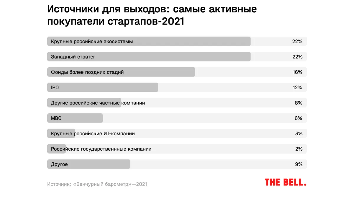Еще в 2014 году «Барометр» определил, что главная боль инвесторов — отсутствие стратегов, а следовательно, выходов, и спустя семь лет сделок, позволяющих венчурным капиталистам заработать на своих вложениях, все еще недостаточно. Поначалу, в 2015–2016 годах, инвесторы в качестве основных стратегов видели, в первую очередь, российские частные (43% опрошенных) или государственные (30%), но отнюдь не зарубежные компании (20%).