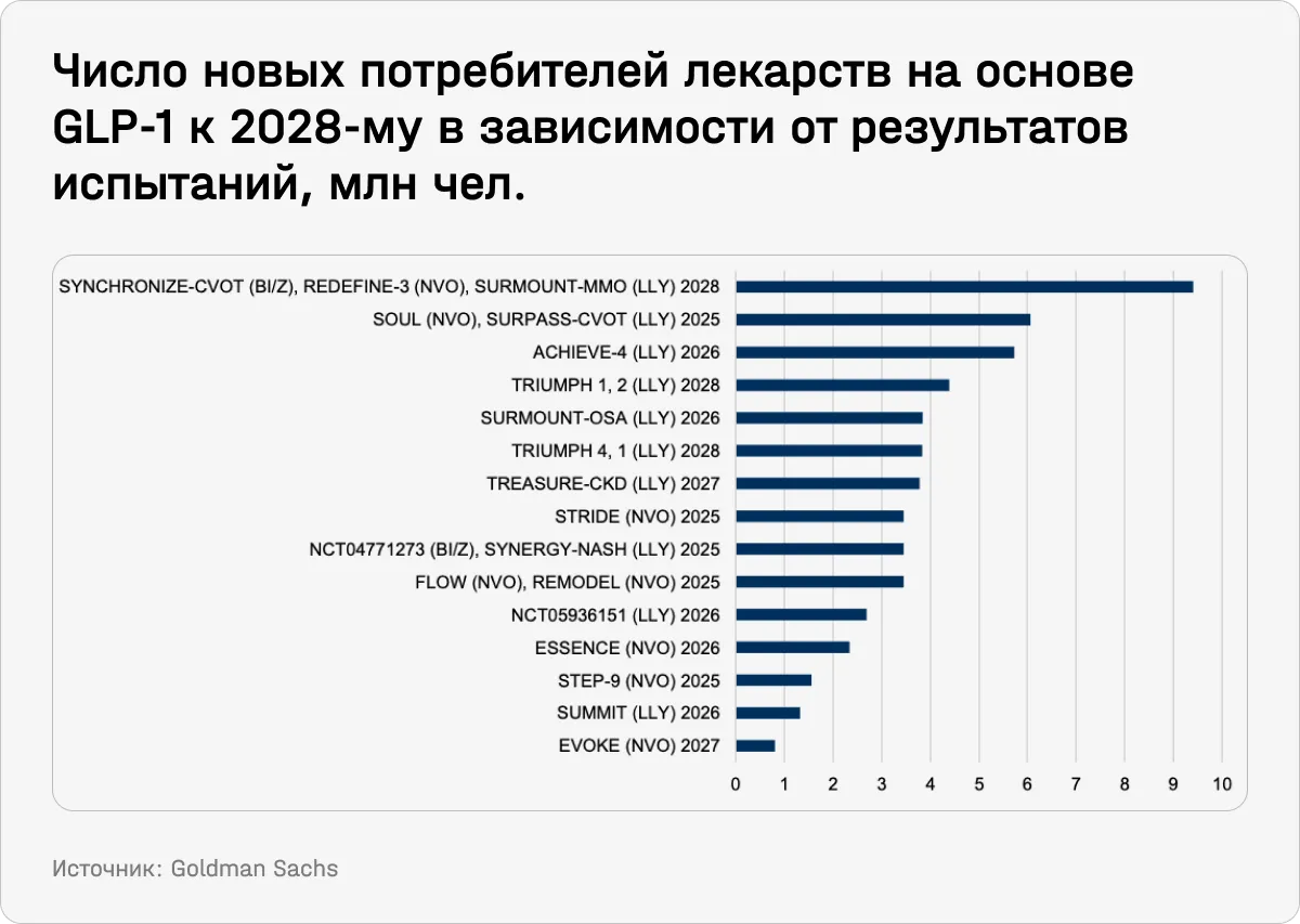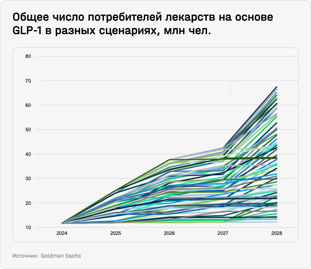 В итоге получилось, что общее число покупателей лекарств на основе GLP-1 (здесь и далее имеются в виду те, кто будет покупать их не только для снижения веса) в США может вырасти до 68 млн человек к 2028-му в сценарии, когда все 23 предстоящих исследования успешны, а производство способно удовлетворить растущий спрос. Но разброс в сценариях — достаточно большой.