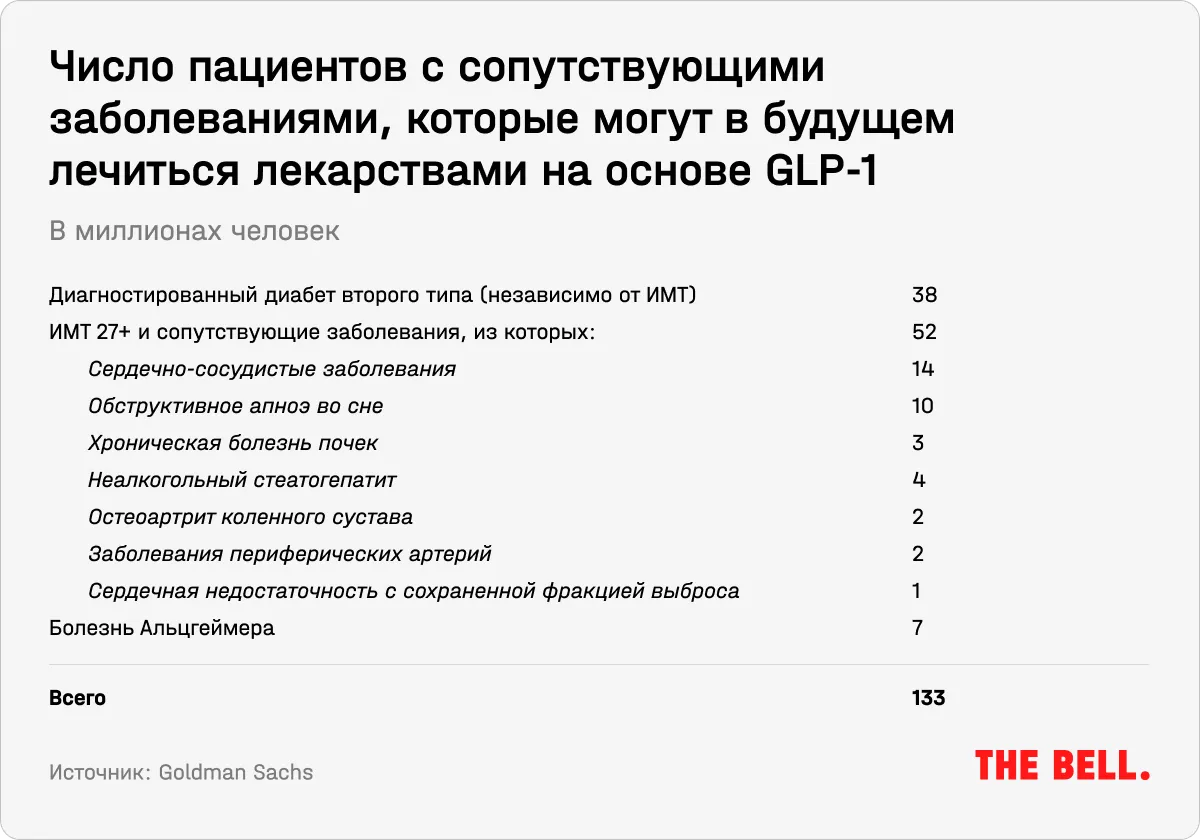 Только в США живут 100 млн взрослых, которые могут начать принимать лекарства на основе GLP-1. И это не только пациенты с ожирением (то есть индексом массы тела, ИМТ, 30+), но и больные диабетом второго типа, а также пациенты с ИМТ 27+ и, по крайней мере, одним сопутствующим заболеванием. Если все предстоящие исследования лечения этих заболеваний будут успешны, общее число потребителей препаратов от ожирения может вырасти на 133 млн, отмечают в GS.