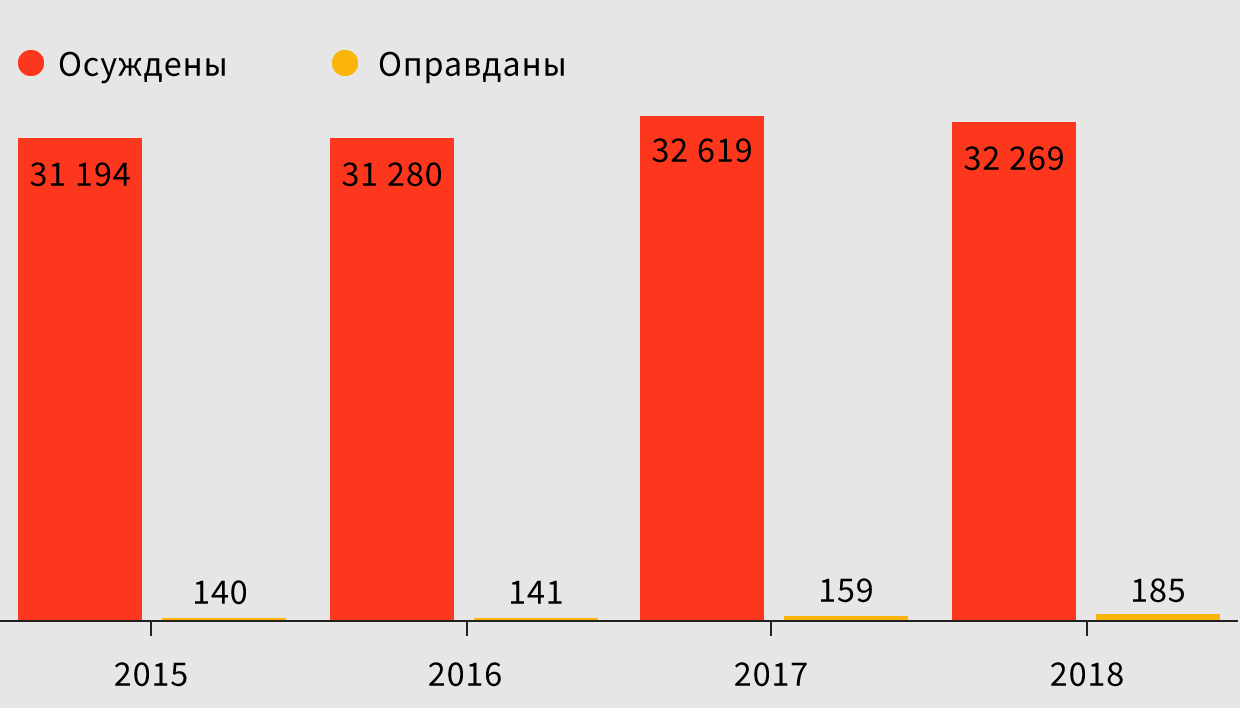 Судебная статистика подтверждает их опасения. Несмотря на ежегодные слова Владимира Путина о том, что «бизнес не должен ходить под статьей», число приговоров по экономическим статьям медленно, но растет. В 2015 году по самым популярным экономическим статьям (мошенничество и легализация преступных доходов, растрата, лжепредпринимательство, уклонение от уплаты налогов, отмывание имущества) были осуждены 31 194 человека, в 2018-м — 32 269. Доля оправдательных приговоров по этим статьям — не больше 0,5%.