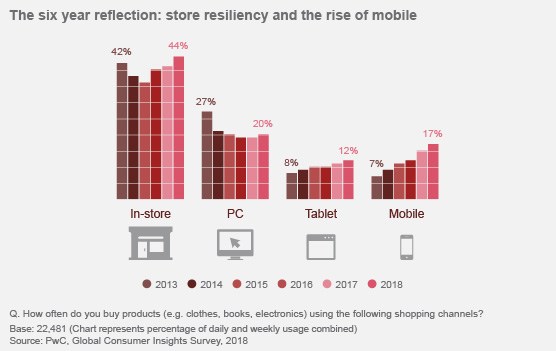 - Соцопросы подтверждают, что инвестиции в офлайн-магазины оправданы. Согласно опросам PwC, количество людей, которые ходят в магазин как минимум раз в неделю, выросло за последние три года — с 40% в 2015 году до 44% в нынешнем. А рынок электронной коммерции, по данным PwC, по-прежнему занимает менее 15% в B2C-отрасли.