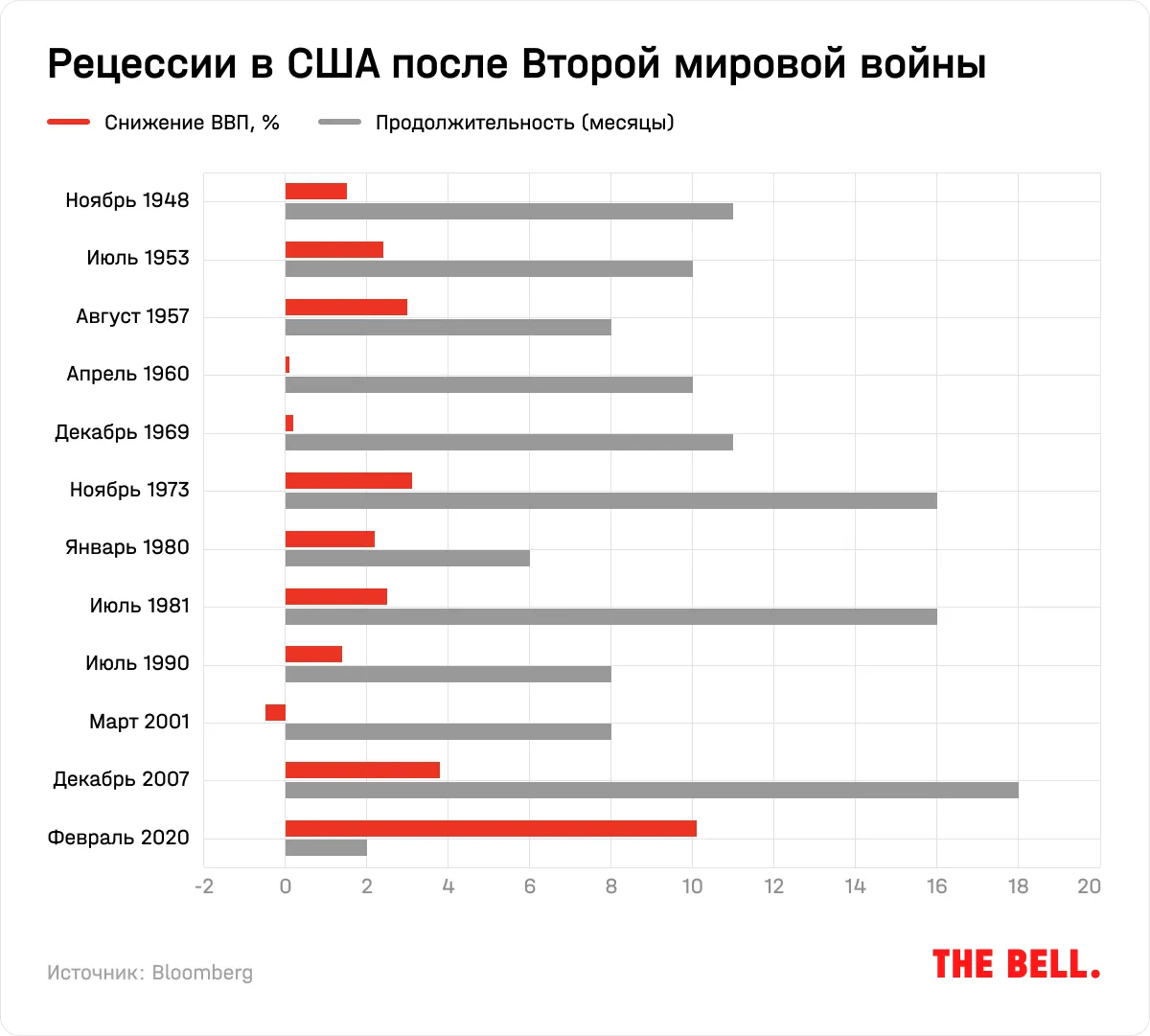 Начиная со Второй мировой войны во время рецессии экономика в среднем падала на 2,5%, безработица росла на 3,8 п. п., а прибыли компаний падали на 15%. Средняя продолжительность рецессии составляла 10 месяцев.
