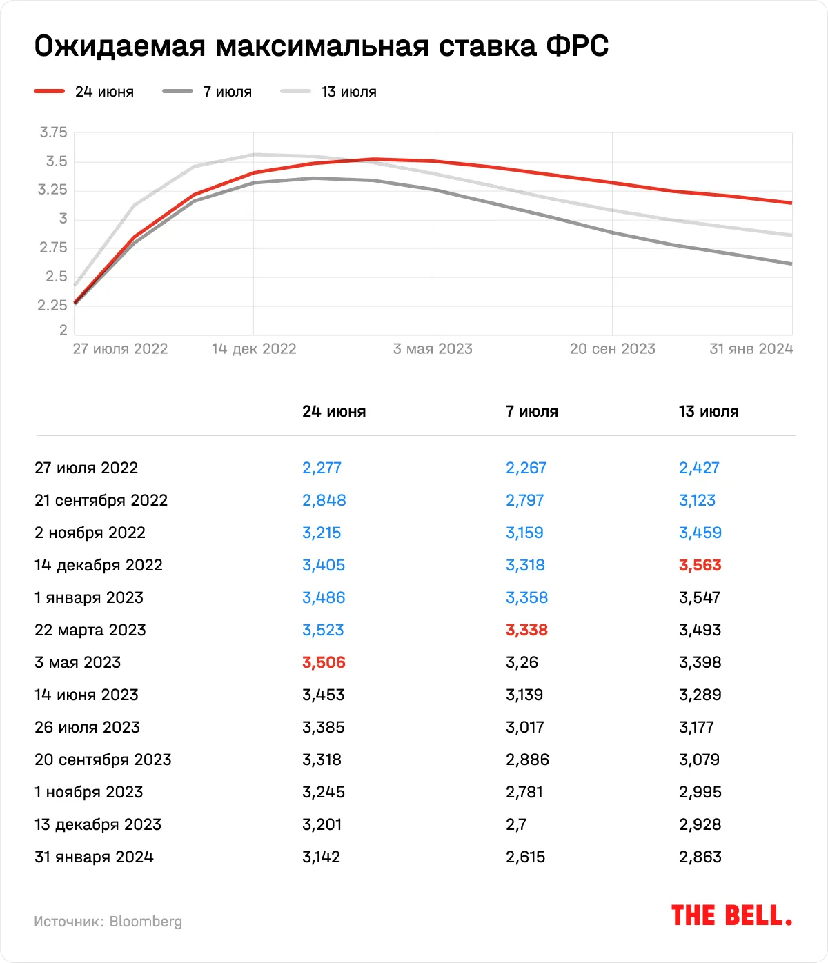 Это уже привело к тому, что в июне инвесторы уменьшили свои ожидания по росту ставок ФРС. Рынки считают, что регулятору придется реагировать на замедление экономики, как это уже было в феврале, когда началась война в Украине. 24 июня консенсус-прогноз рынков, согласно Bloomberg World Interest Rate Probabilities, состоял в том, что максимальная ставка в этом цикле подъема составит 3,523 и будет достигнута в марте 2023 года, а к концу 2024 года составит 3,142. Но с тех пор инвесторы снизили ожидания, а 13 июля, после выхода данных об инфляции, рынки поверили в гораздо более быстрый подъем ставки (до максимума в декабре 2022-го в 3,563) и гораздо более резкое снижение.