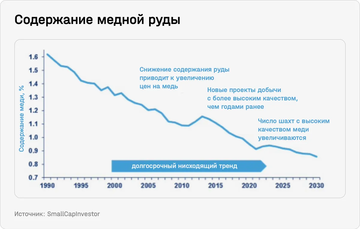 Кроме того, снижается содержание количества руды из-за истощения шахт. Получается, что необходимо переработать и измельчить гораздо больше горной породы, чтобы получить такое же количество меди. Потенциально, это может привести к сокращению мирового производства меди и увеличению давления на ценообразование.