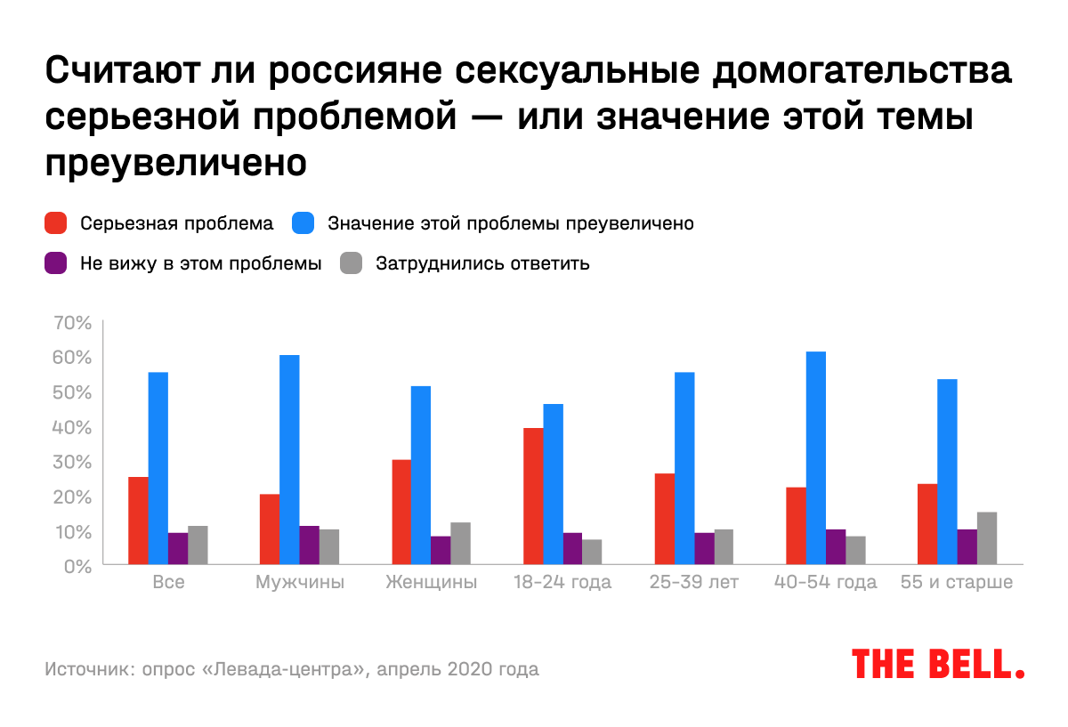 В том, что новая волна #MeToo прокатилась именно по независимым редакциям, в которых много молодых сотрудников, неудивительно. Журналисты, которые постоянно пишут об этих проблемах, обращают на них больше внимания. Опросы «Левада-центра» (данные представлены на графике ниже) свидетельствуют: самый высокий уровень неприятия харассмента в России демонстрируют именно представители возрастной группы 18–24 лет. Первый громкий скандал этим летом, что характерно, потряс филологический факультет МГУ. Кроме того, у работников независимых СМИ может быть меньше страха быть уволенными за участие в публичных скандалах.