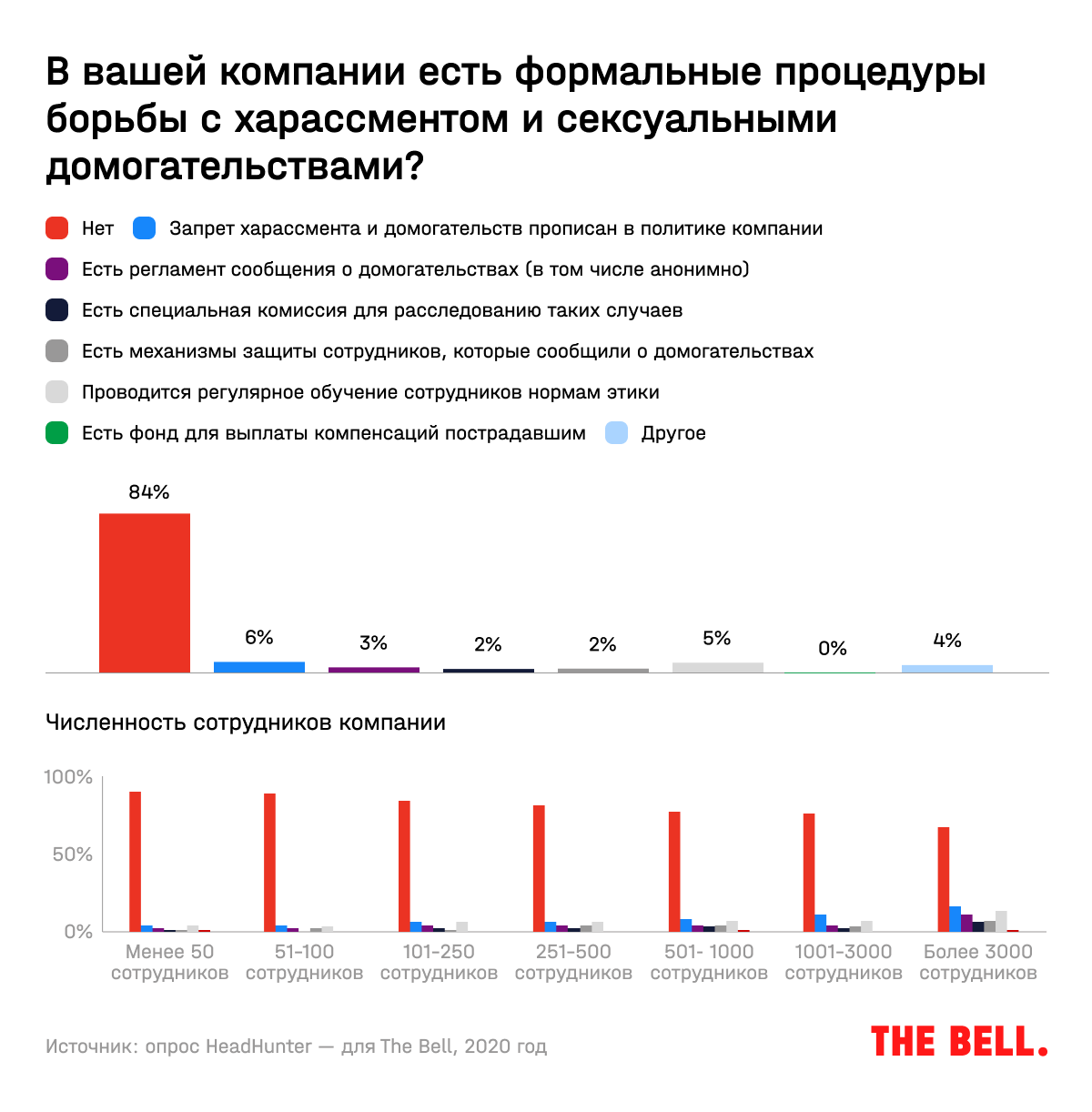 От харассмента и сексуальных домогательств на работе страдают не только сотрудники СМИ. Просто истории из других сфер реже просачиваются в соцсети. Мы решили составить общую картину. По просьбе The Bell сервисы HeadHunter и SuperJob опросили работников компаний разного размера из разных областей. Полученные данные мы обсудили с участниками рейтинга лучших работодателей России, юристами, HR-консультантами и самими жертвами.