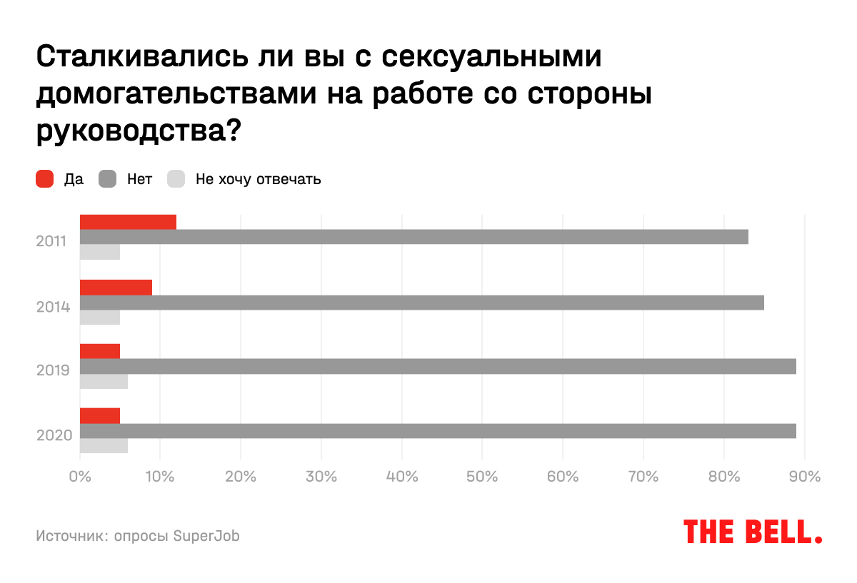 Рекрутинговый сервис SuperJob делает опросы о харассменте и домогательствах на работе уже много лет. Результаты вас могут удивить: в 2011 году с харассментом со стороны руководства сталкивались 12% респондентов, в 2020-м — 5%. Руководительница исследовательского центра сервиса поиска высокооплачиваемой работы SuperJob Наталья Голованова полагает, что все дело в «публичном обсуждении проблемы и смелости жертв, открыто рассказывающих о ситуации».
