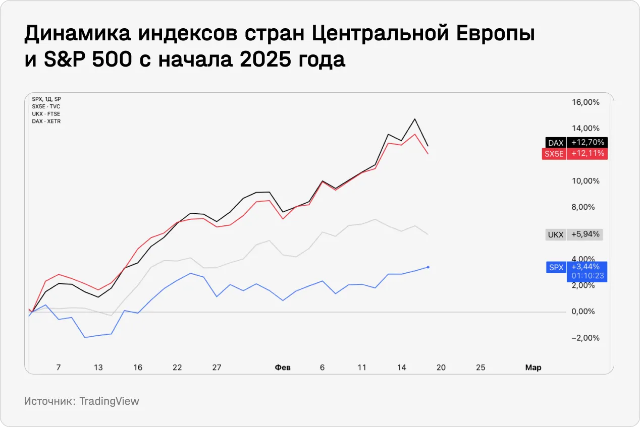 На рынках Европы по-прежнему сохраняется значительная премия за военный риск. Но динамика рынков сигнализирует о том, что инвесторы, сократившие вложения в регион с началом конфликта, возможно, уже вернулись. Немецкий DAX и панъевропейский Euro Stoxx обновляют исторические максимумы, и даже традиционно отстающий британский FTSE 100 опережает S&P 500 с начала 2025 года. «Это один из самых сильных стартов года для региона с 1987 года», — пишет Financial Times. Политическая составляющая остается ключевым драйвером, отмечает издание.
