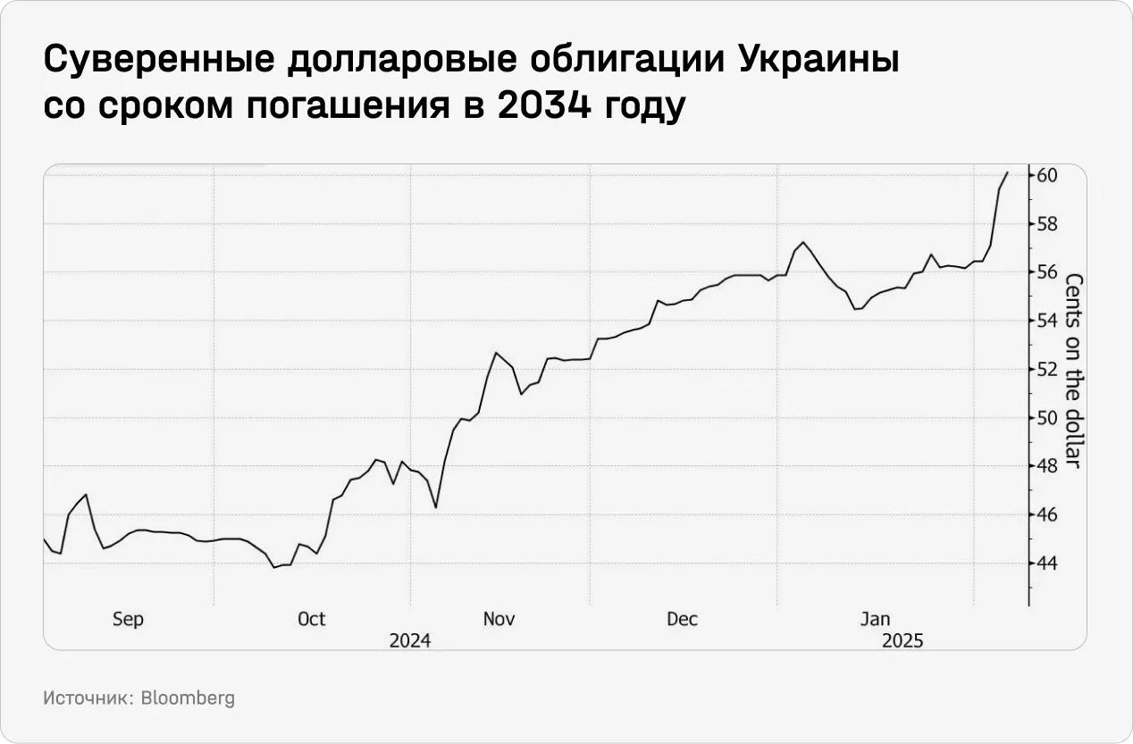 Закладывать в цены активов ожидания перемирия инвесторы начали еще до вступления Трампа в должность: с начала года украинские долларовые облигации принесли 7,8%, оставаясь в числе лидеров среди суверенных облигаций развивающихся стран. Бумаги с выплатами в 2034 году в начале февраля превысили 60 центов за доллар — это максимум с момента их выпуска в прошлом году. В 2024 году их рост составил около 60%, пишет Bloomberg.