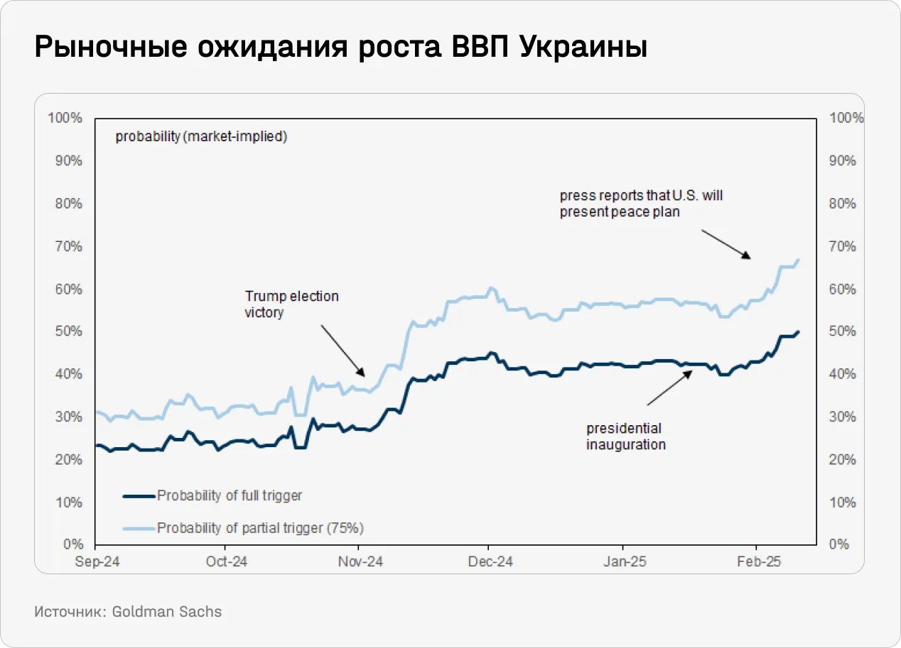Goldman Sachs перевел движение цен на активы как отражение рыночных ожиданий относительно вероятности заключения мирного соглашения, которое станет катализатором восстановления экономики Украины.