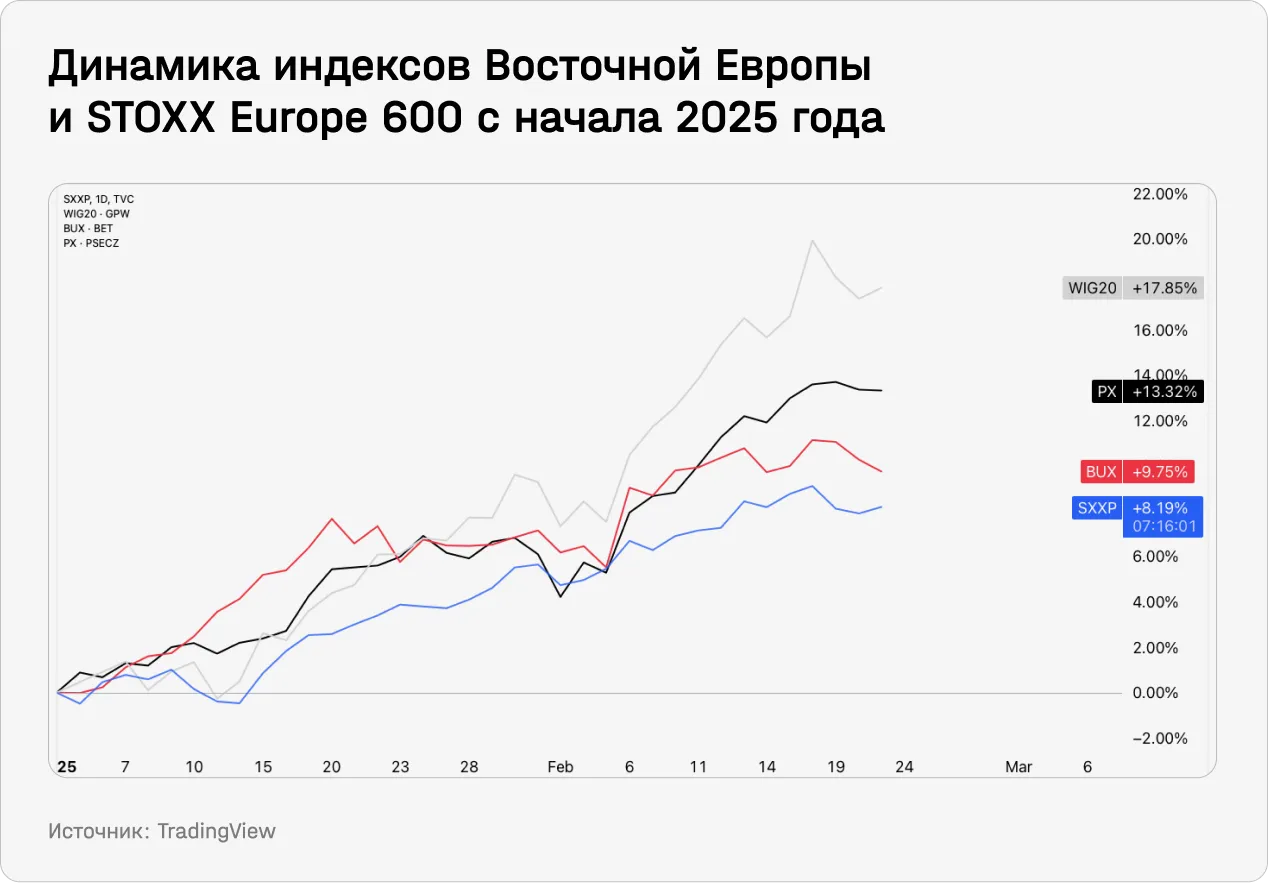 Фондовые рынки Восточной Европы тоже демонстрируют уверенный рост. Польский индекс WIG20, который в 2024 году снизился на 6,4%, в январе подскочил на 14% на ожиданиях о заключении мира. Это его лучший месячный результат с 2012 года. Польский фондовый рынок — самый крупный в регионе. Венгерский BUX в январе прибавил 8,8%, а чешский PX вырос на 7,4%, обогнав индекс развивающихся рынков MSCI Emerging Markets.