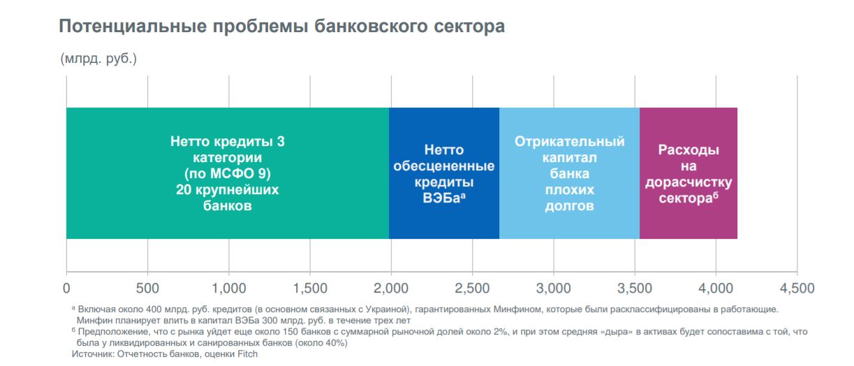 - К проблемным активам агентство относит кредиты третьей категории по классификации МСФО 9 (значительный кредитный риск, обесценение от 21% до 50%) с просрочкой более 90 дней 20 крупнейших банков. Их общий объем агентство оценивает в 2 трлн рублей. Также агентство выделяет 650 млрд обесцененных кредитов Внешэкономбанка (ВЭБ) и около 900 млрд рублей приходится на отрицательный капитал банка плохих долгов (был создан ЦБ на базе банка «Траст» для работы с непрофильными активами санируемых банков). Необходимые дополнительные расходы на очистку банковского сектора Fitch оценивает в 550 млрд рублей.