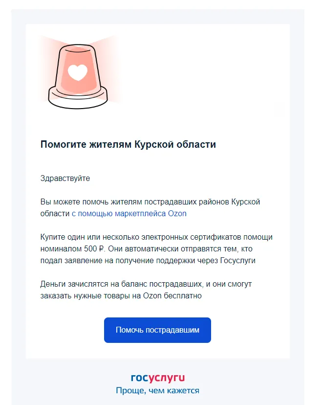 Сайт «Госуслуги» разослал россиянам предложение помочь жителям Курской области в один день с объявлением об этой программе помощи на сайте интернет-ритейлера Ozon. Любой желающий может купить на сайте один или несколько сертификатов на 500 рублей, а код от него будет отправлен одному из пострадавших, подавших на помощь через «Госуслуги». Зачисленные получателем через аккаунт Ozon баллы можно будет потратить на покупки через маркетплейс.