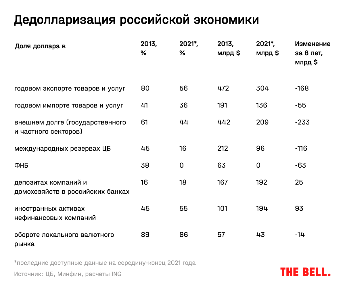 - Минфин поступил еще более радикально, полностью отказавшись в 2021 году от доллара в суверенном ФНБ: его доля снизилась с 38% в 2013 году ($63 млрд) до нуля.