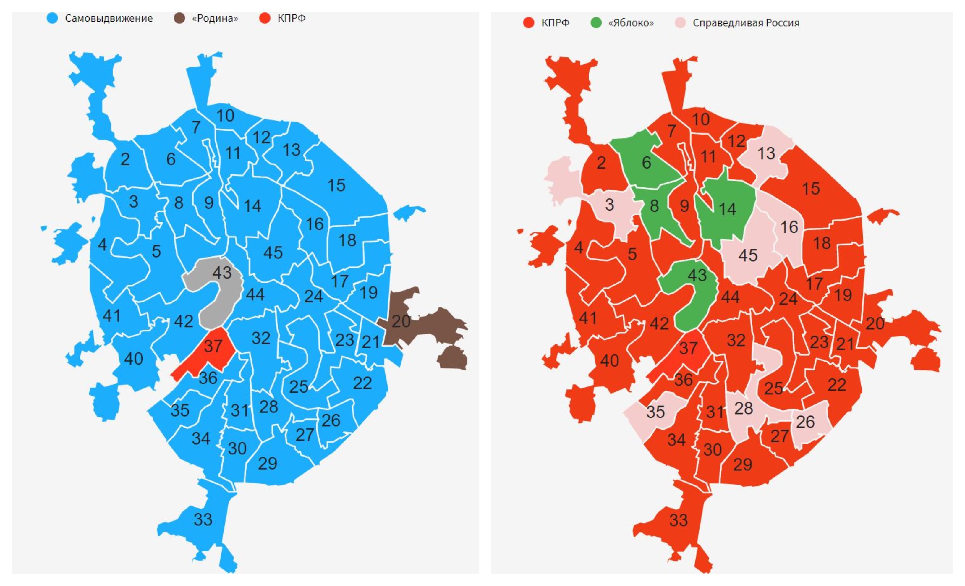 - Для удобства избирателей The Bell сделал две интерактивные карты. На одной из них можно узнать все о кандидатах от мэрии, на второй — о кандидатах, за которых предлагает голосовать Навальный. На картинке слева — какой должна выглядеть Мосгордума по планам мэрии («самовыдвиженец» здесь — синоним слова «единоросс»), на картинке справа — какой она будет в маловероятном случае полной победы «умного голосования».