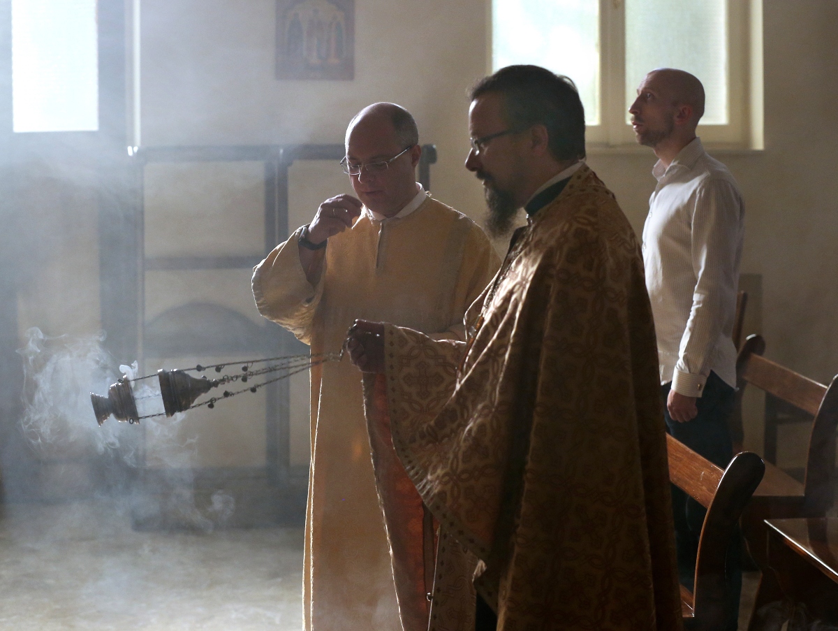 25 октября 2015 года. Сергей Гаврилов (слева) совершает служение чтеца и пономаря во время посещения делегацией российских парламентариев храма священномученика Игнатия Богоносца в Дамаске (Сирия). Фото: Валерий Шарифулин/ТАСС
