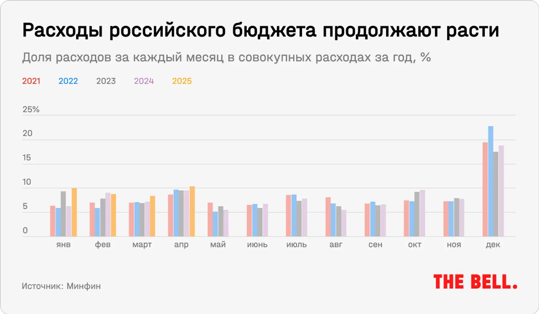 В этих условиях Минфин даже попробовал провести решение о снижении цены отсечения нефти до $50 за баррель, что позволило бы пополнять запасы ФНБ, несмотря на падение цен на сырье. Но экономическая целесообразность, похоже, снова уступила политическим соображениям. Цену отсечения оставили на прежнем уровне, а расходы бюджета (особенно по секретным статьям, которые по большей части связаны с обороной) продолжили быстро расти, несмотря на замедление экономического роста. Если с января по апрель 2024 года правительство потратило 31,9% от запланированных расходов, то за четыре месяца 2025-го — уже 37,4%.