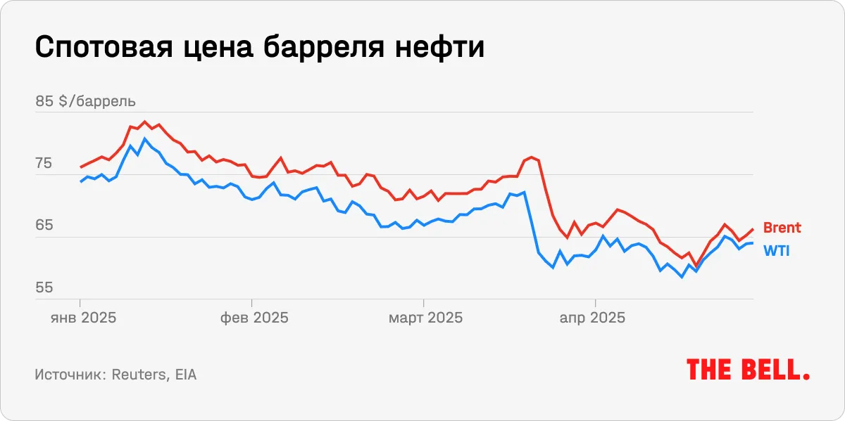 Средняя цена российской нефти Urals в марте и апреле составила $59 и $54,8 за баррель соответственно (средняя цена с начала года с учетом более «дорогих» января и февраля — $60,8 за баррель). Но бюджет России на 2025 год сверстан из среднегодовой цены $69,7 за баррель, а цена отсечения, при которой «излишки» нефтяных доходов идут в Фонд национального благосостояния (ФНБ), составляет $60.