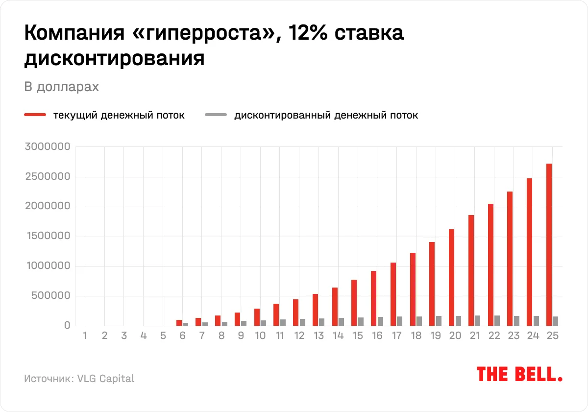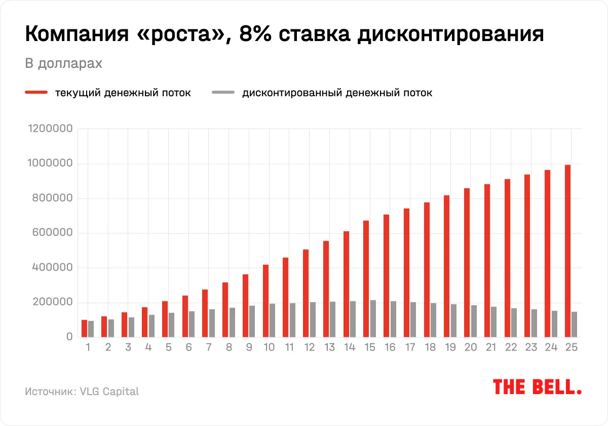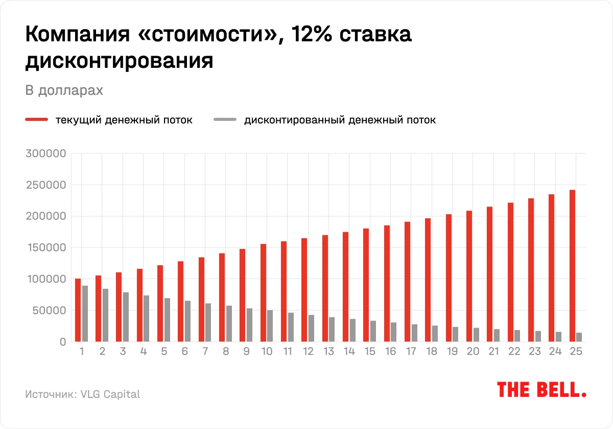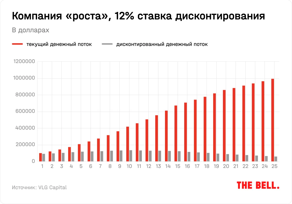 Предположим, компания А имеет $100 000 в год свободного денежного потока. Это стабильный бизнес, FCF которого будет расти на 5% в год в ближайшие 10 лет, и остаточной ставкой роста (за пределами периода оценивания) в размере 3% годовых. Такая остаточная ставка отражает долгосрочное ожидание по изменению доступного компании рынка и инфляции, подразумевая, что такой бизнес будет сохранять свою долю рынка на длинном горизонте. Если мы дисконтируем ожидаемые денежные потоки следующих 25 лет со ставкой 12% годовых, то стоимость всего бизнеса составит $1,088 млн: