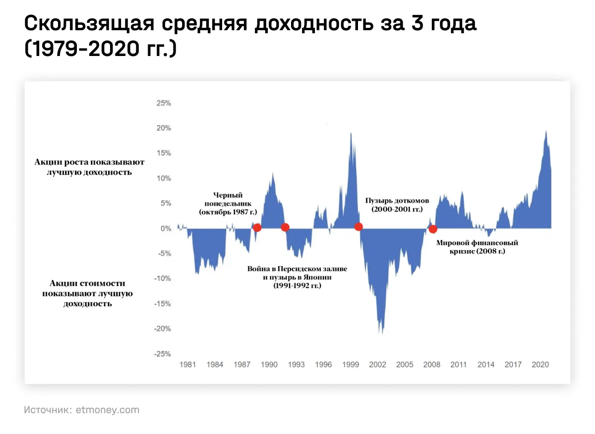 В то же время при росте инфляционного давления и замедления экономики ввиду усиления монетарных стимулов акции стоимости показывают доходность лучше, чем акции роста. Этот период времени характеризуется ростом ставок вследствие ужесточения денежно-кредитной политики.