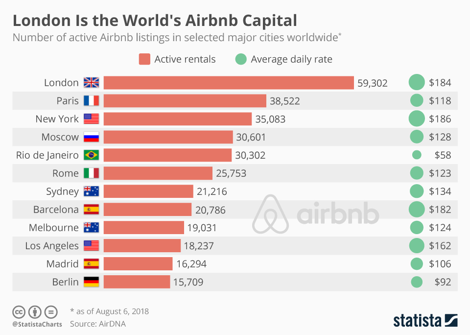 Лондон — мировая столица Airbnb: в городе действуют почти 60 тысяч предложений сервиса при средней цене за сутки в $184. Самое дорогое жилье у сервиса в Нью-Йорке — $186 за сутки (35 тысяч предложений), самое дешевое — в Рио-де-Жанейро, $58 (30 тысяч предложений). Москва в списке идет четвертой — одни сутки обойдутся в среднем в $128 (30,6 тысяч предложений).