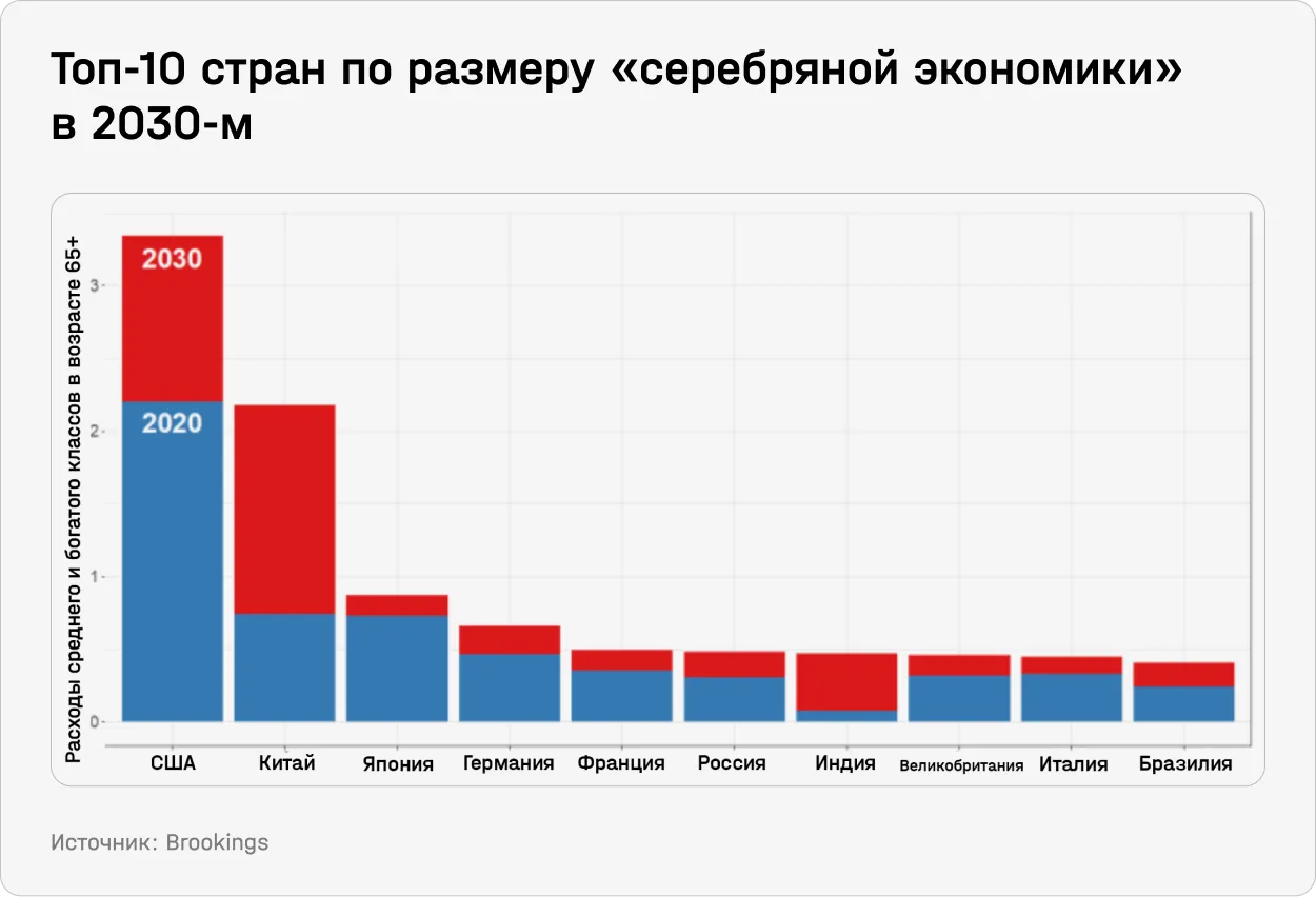 World Data Lab прогнозирует, что расходы группы людей старше 50 лет будут расти с CAGR 6,5% в течение следующего десятилетия. Уже в 2024 году на долю пожилых людей придется 42% общих расходов во всем мире. Согласно данным исследовательского института Brookings, к 2030 году траты старшего поколения во всем мире увеличатся с $8,7 трлн в 2019 году до $15 трлн.