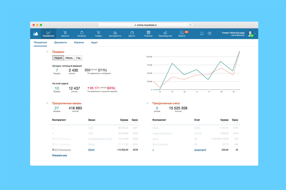 Продажи товаров, которые были зафиксированы при помощи сервиса учета, — это хороший источник данных для CRM-системы, где за пару кликов можно создать отчеты по продажам, рентабельности, остаткам, клиентам и т.д. В идеале сервис учета и CRM должны быть в одном решении: не придется работать параллельно в двух системах или настраивать интеграцию. По этому пути в свое время пошел «МойСклад», объединив все в одном интерфейсе. О том, что предпринимателям это удобно, говорят цифры: более 30 тыс. клиентов пользуются сервисом регулярно.