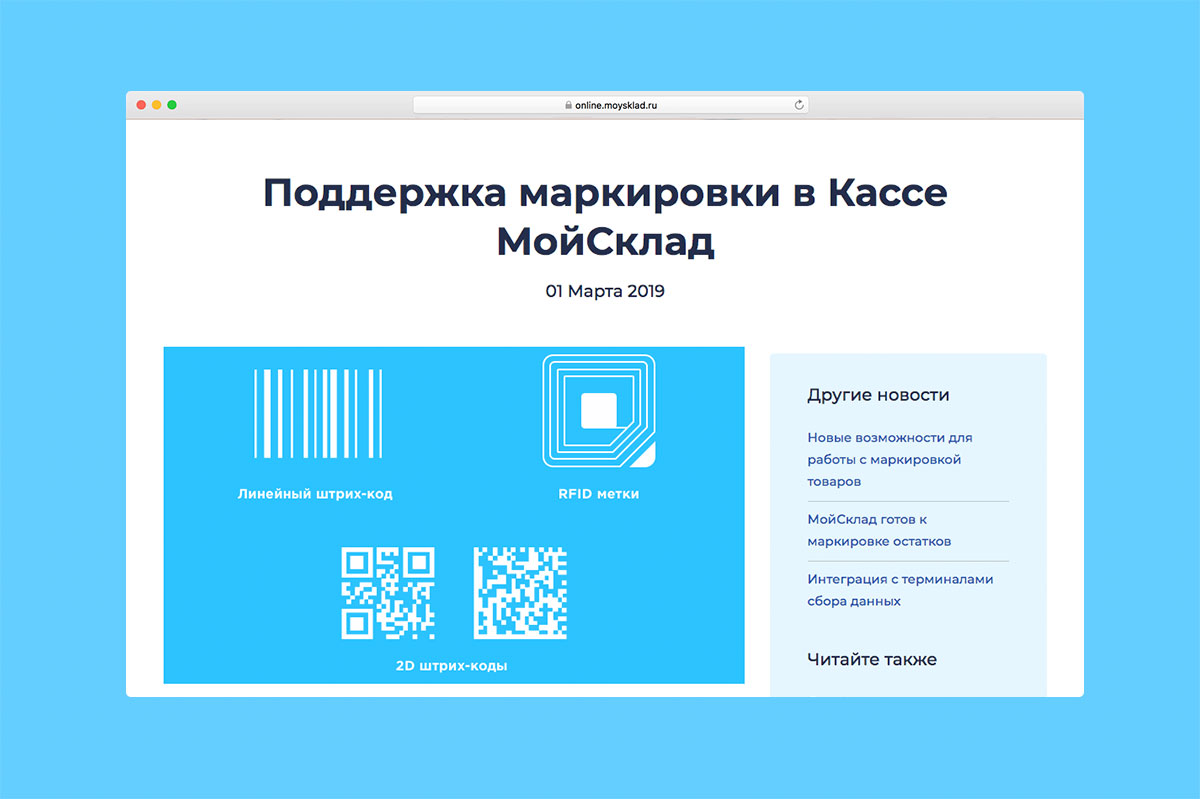 В «МоемСкладе» можно бесплатно маркировать товар: прямо из интерфейса клиенты получают коды, создают и отправляют на печать этикетки, вводят в оборот маркированную продукцию, продают ее через кассу. «МойСклад» поможет разобраться в процессе с нуля, узнать о последних изменениях от оператора маркировки и настроить работу в сервисе. Сервис предлагает бесплатные консультации, полезные статьи и вебинары.