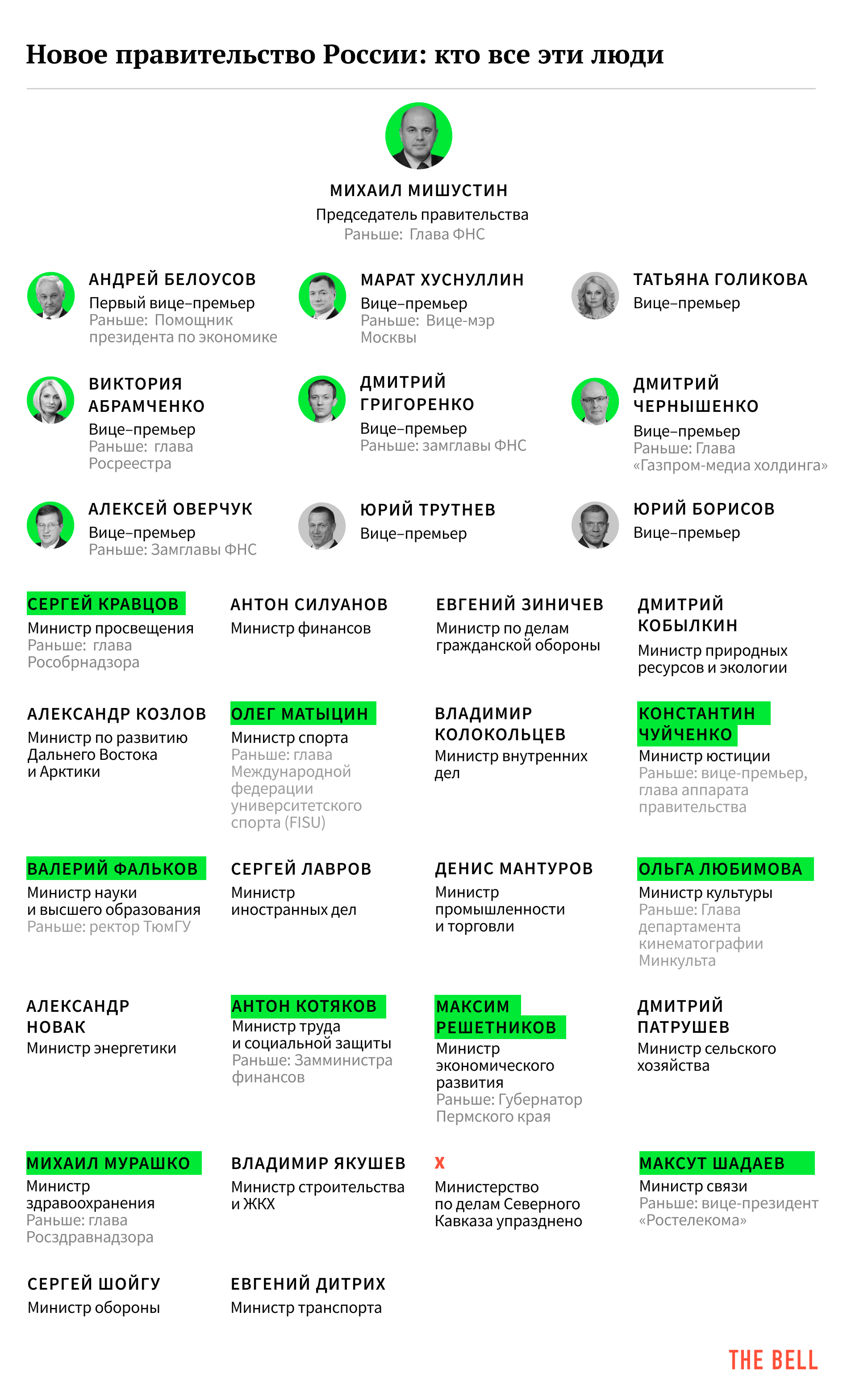 Из девяти оставшихся вице-премьеров шесть новых. И, судя по ним, Мишустину удалось значительно обновить правительство собственными кадрами. Кроме двух своих бывших замов в ФНС (Дмитрия Григоренко, который возглавил аппарат правительства, и Алексея Оверчука, который будет курировать цифровые технологии), «Ведомости» насчитали еще как минимум троих его ставленников: по данным издания, у премьера отличные давние отношения с бывшим замом Сергея Собянина Маратом Хуснуллиным (как и в московском правительстве, он будет отвечать за строительство) и бывшим главой «Газпром-медиа» и устроителем Олимпиады Дмитрием Чернышенко (будет курировать спорт и культуру). К людям Мишустина издание причисляет и Викторию Абрамченко, которая вместо Алексея Гордеева будет курировать сельское хозяйство (она была подчиненной Мишустина в Роснедвижимости, когда Мишустин возглавлял это ведомство).
