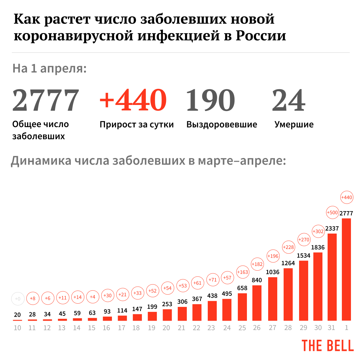 Прирост заболевших в среду, 1 апреля, оказался меньше, чем во вторник, когда число диагностированных с коронавирусом выросло на 500.