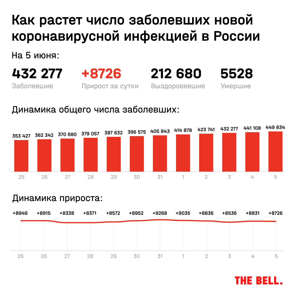 - Заразились: 449 834 человека (+8726 за сутки, 4 июня — +️8831).