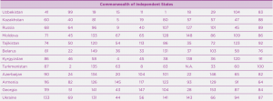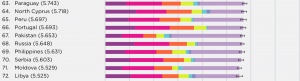 • Россия за год упала в рейтинге с 59-й на 68-ю строчку — сейчас она находится между Пакистаном и Филиппинами. С 2005–2008 годов ее индекс улучшился совсем незначительно. Это может объясняться тем, что в России плохо обстоят дела с коррупцией и свободой. Обосновывая позицию страны, эксперты отмечают, что по уровню коррупции она находится на 127-м месте из 156 стран, по свободе — на 107-м, по щедрости — на 101-м, по средней продолжительности жизни — на 89-м, по объему ВВП на душу населения — на 45-м месте.