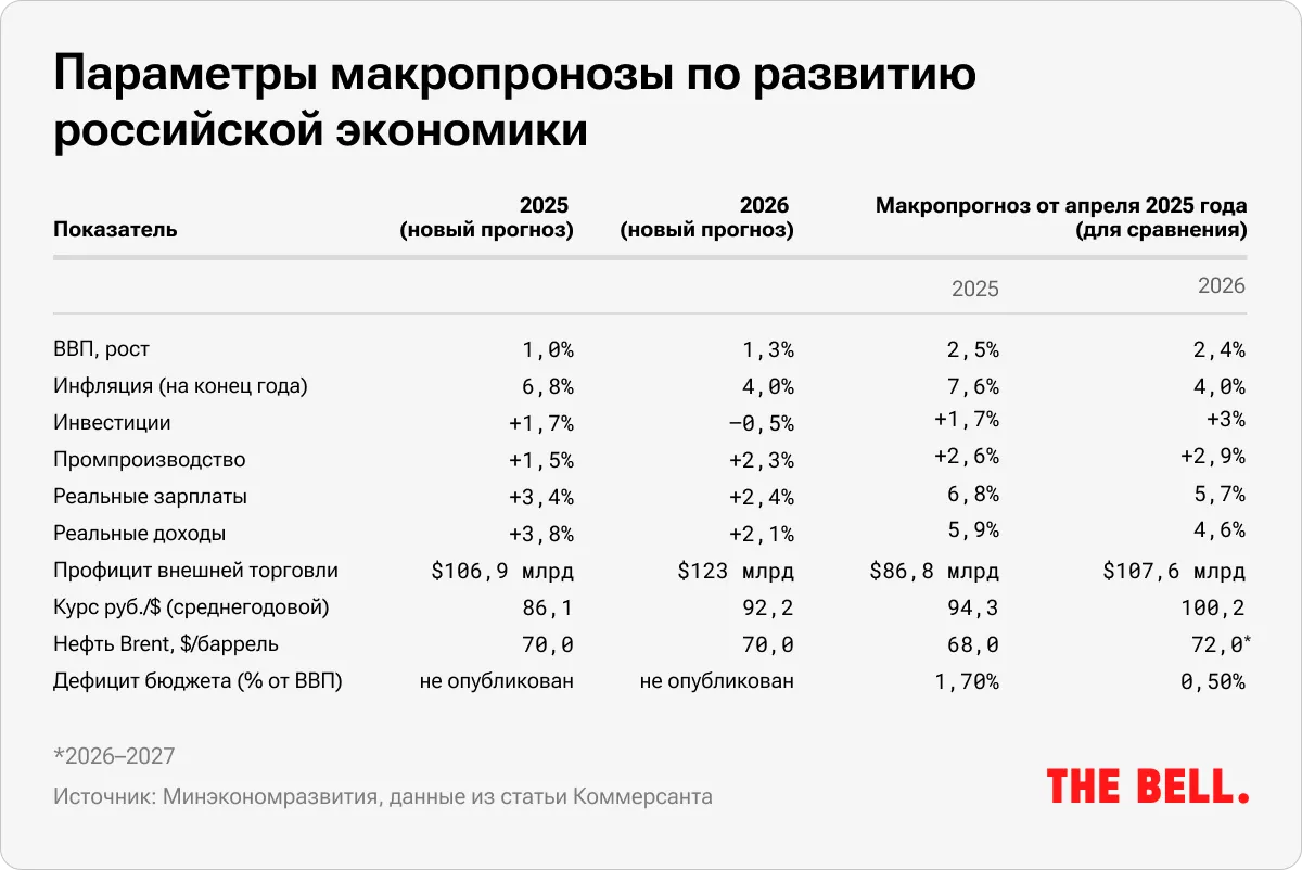• Снижен и прогноз по инвестициям: в 2026 году вместо ожидавшегося ранее роста на 3% теперь закладывается спад на 0,5%. Минэкономики объясняет это «высокой базой последних лет» и жесткой денежно-кредитной политикой.