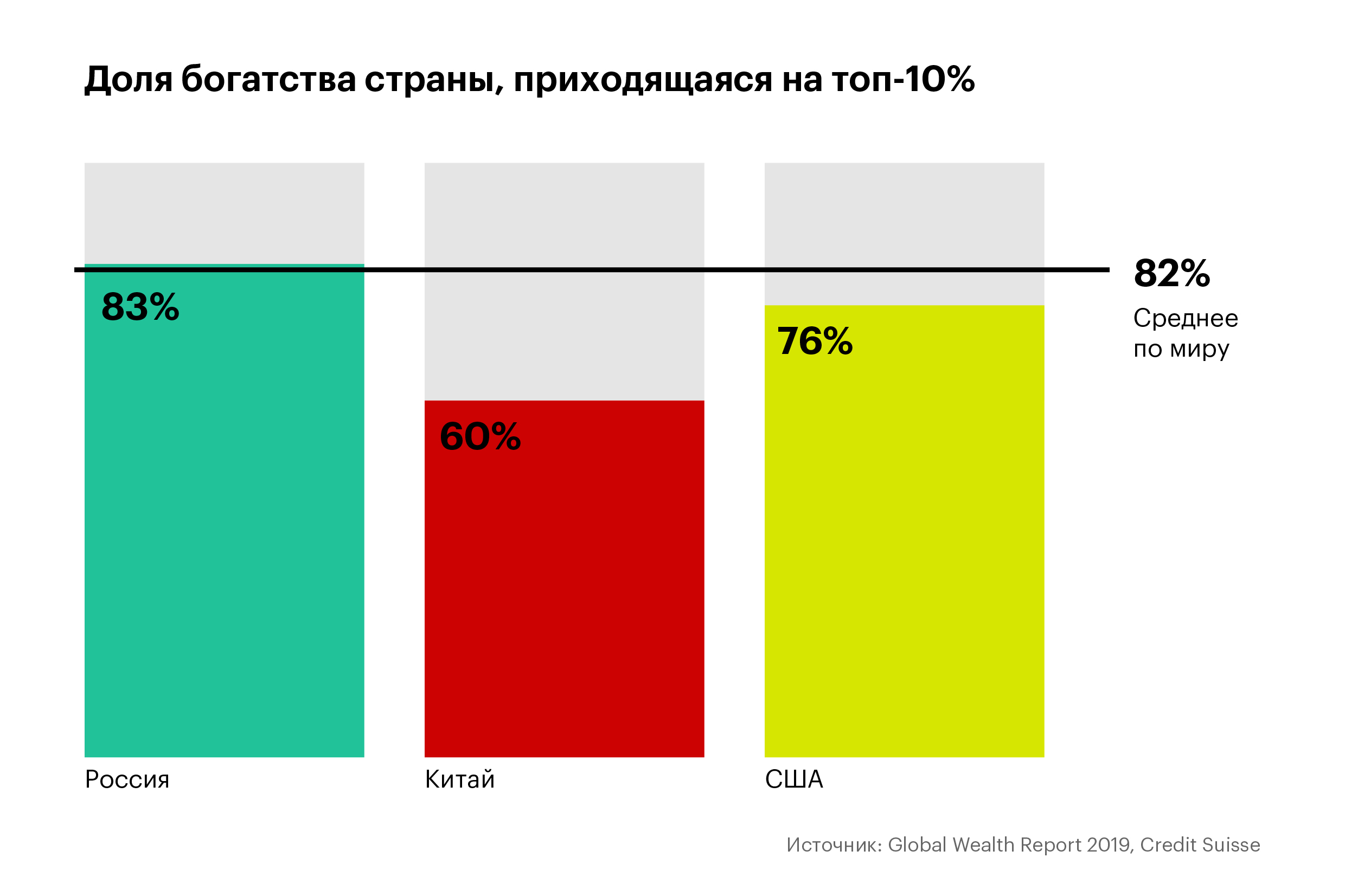 Что у нас. На долю 10% самых состоятельных россиян приходится 83% богатства страны. Это больше, чем у Китая (60%) и США (76%) и выше среднемирового показателя (82%). Такая концентрация богатства при скромном уровне общего благосостояния позволяет предположить, что в России 110 долларовых миллиардеров, считают в Credit Suisse.
