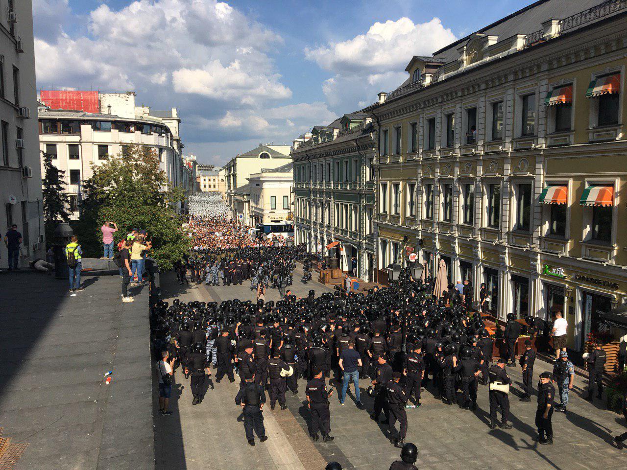 Главные события сейчас в районе памятника Юрию Долгорукому и в Столешниковом переулке, передает редактор The Bell. Сейчас, по его оценке, там находится около двух-трех тысяч митингующих. Весь переулок забит людьми, полиция оттесняет их в сторону Большой Дмитровки — в общей сложности на месте три цепи полиции, в каждой примерно по сто человек. Митингующие скандируют «пропускай!» и пытаются сопротивляться, первый ряд протестующих сцепился руками. Несколько человек полиции удалось выхватить в свои ряды и задержать. Журналистку РБК Елену Шевелеву, одетую в жилет «Пресса», грубо вытолкнули из-за оцепления, ее ударил сотрудник полиции. У нее есть аккредитация от МВД.