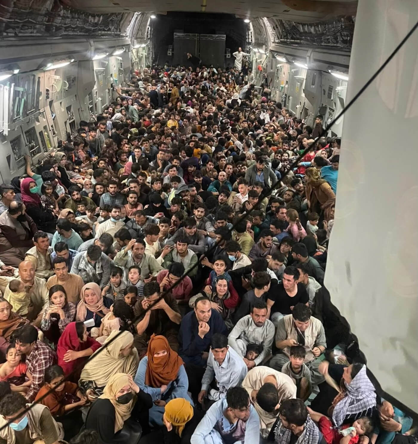 Поздно вечером 15 августа военно-транспортный самолет Boeing C-17 Globemaster III американских ВВС эвакуировал из Кабула около 640 мирных жителей Афганистана. Изначально экипаж самолета не собирался брать с собой столько пассажиров, но перед взлетом, во время паники в аэропорту, люди стали запрыгивать на полуоткрытую рампу самолета.