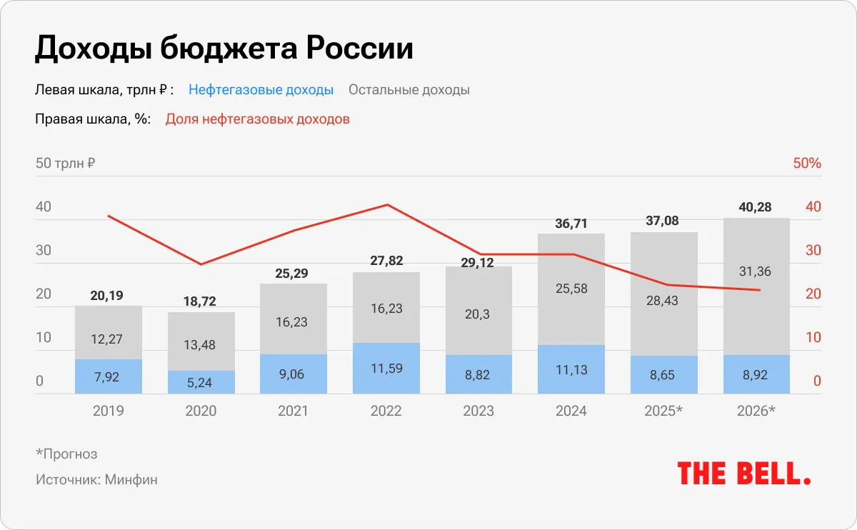 Главная проблема российской экономики в связи с низкими ценами на нефть — растущие, несмотря на это, расходы бюджета из-за войны. На 2026 год правительство запланировало рекордные расходы в 44,1 трлн рублей, где львиная доля (40%, или 16,8 трлн рублей) придется на военные статьи и силовой аппарат — «национальную оборону», «национальную безопасность» и «правоохранительную деятельность».