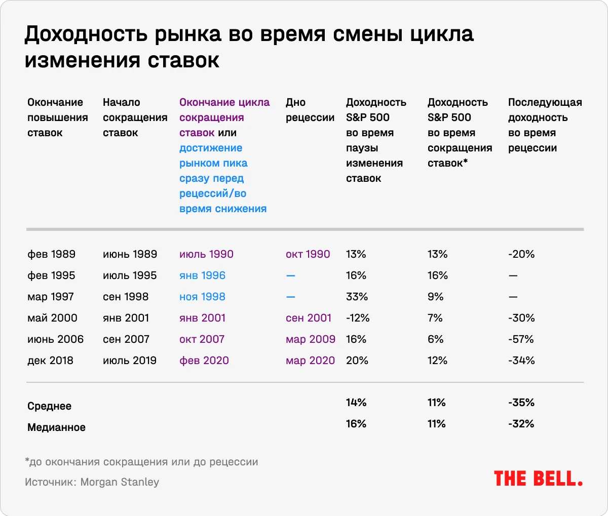 Тем, кто пытается угадать идеальный момент для возвращения в ближайшие месяцы, аналитики Morgan Stanley (MS) советуют не торопиться. Подходящим моментом для увеличения вложений в акции, по их мнению, может стать пауза между финальным повышением ставок ФРС и началом цикла их снижения. В этот период рынки обычно начинают осознавать, что ставки больше не будут повышаться, при этом рецессия еще не наступает и не сказывается на прибылях компаний.