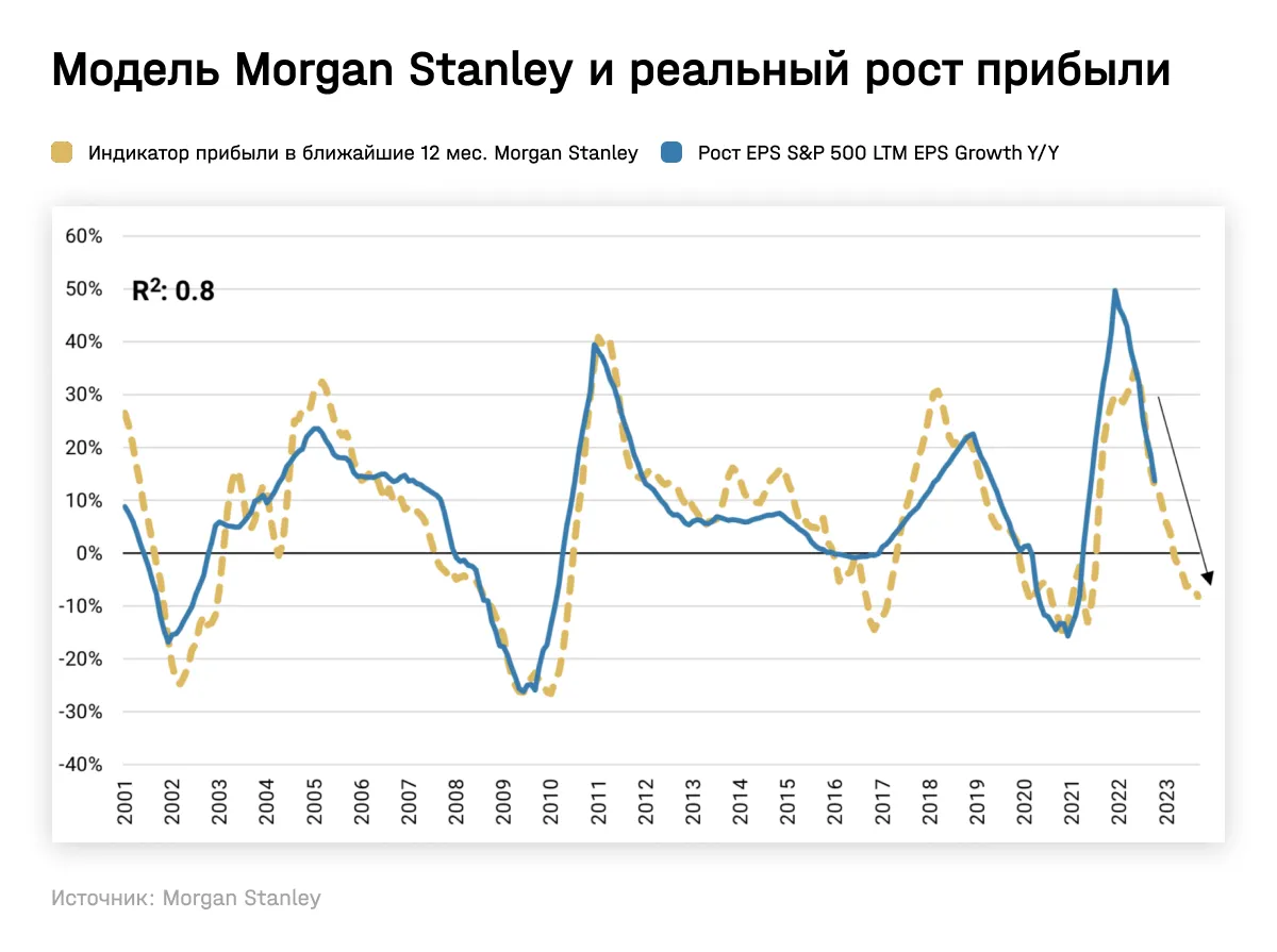 Ранее модель MS, учитывающая макроэкономические показатели (промышленный PMI, потребительскую уверенность, количество новых строящихся домов, кредитные спреды), работала достаточно точно. Наибольшее расхождение с фактической EPS было в 2001 и 2008 годах, когда экономика США была в рецессии. Сейчас в базовом сценарии MS она не предусмотрена, а рост реального ВВП составит 0,5% в 2023 году.