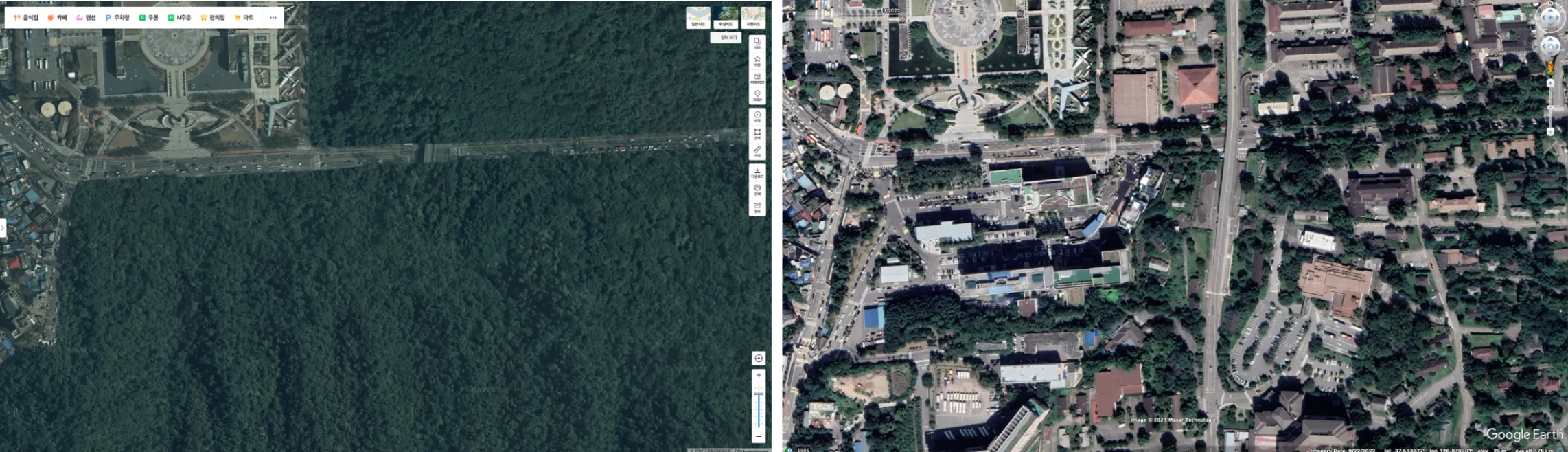 Такие страны, как Южная Корея, сами могут фальсифицировать снимки на своих картографических платформах. На примере ниже поля и деревья, которыми корейская картографическая система Naver Maps закрыла правительственные здания, но они видны на Google Maps. В таких случаях лучше перепроверять местность на альтернативных картах.