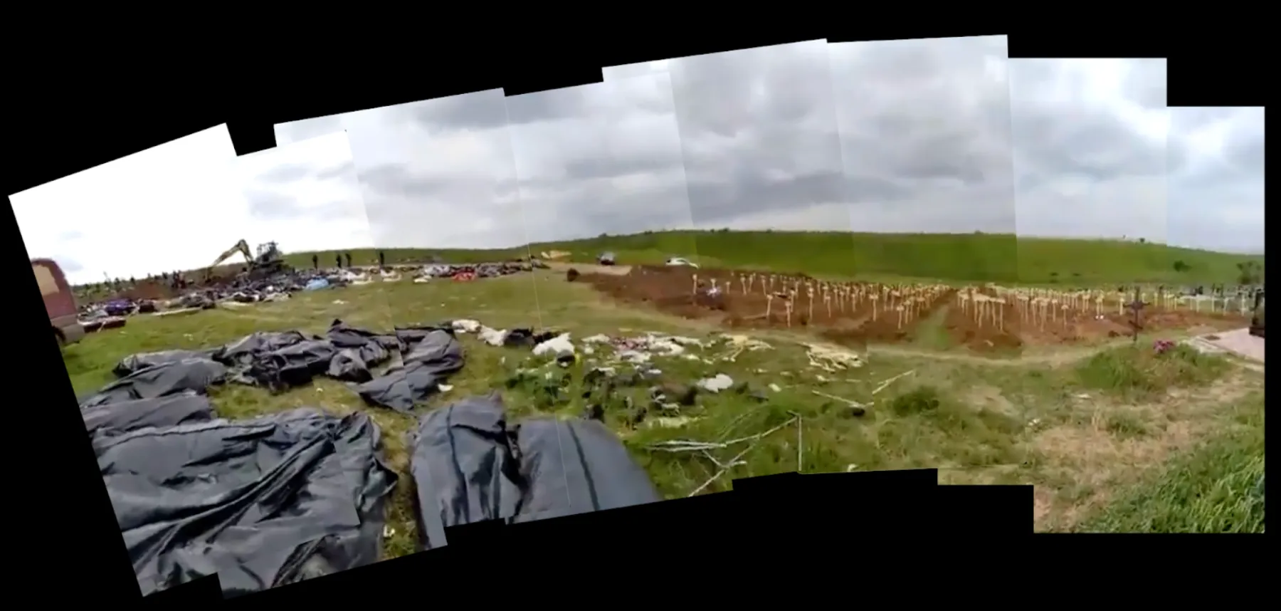 Вот лишь несколько примеров работы со спутниковыми снимками. Эксперты CIR обратили внимание на видео в твиттере с братской могилой в Виноградном, куда российские военные, по сведениям очевидцев, свозили тела погибших в Мариуполе. Из кадров этого видео специалисты CIR составили панорамный снимок, сделали репортерский набросок этого места и, действительно, нашли его в Виноградном с помощью Google Earth Pro. Кадры, на которых определяются захоронения, появляются начиная с апреля 2022 года. После площадь братской могилы только увеличивается.