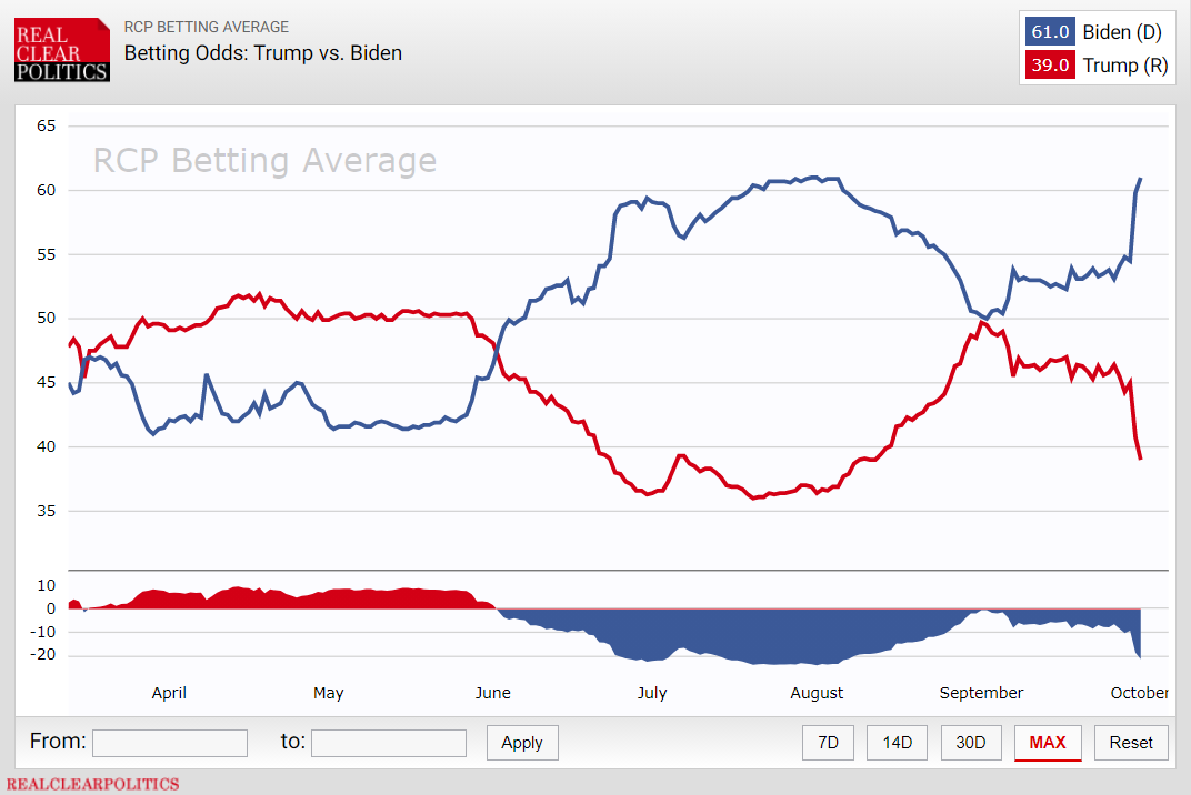 Сравнение сводного графика ставок букмекерских контор показывает: на этот раз букмекеры отдают намного более определенное предпочтение одному из кандидатов, и этот кандидат — Джо Байден. В котировках букмекеров он опережает Трампа на 22 пункта — 61% против 39% (Клинтон перед выборами 2016 года имела в глазах букмекеров перевес лишь в 3,2 пункта). Еще в начале сентября букмекеры оценивали шансы кандидатов как почти равные, но после первых очных дебатов кандидатов на этой неделе рейтинг Байдена взлетел вверх. Ставки реагируют на политические события быстрее опросов.