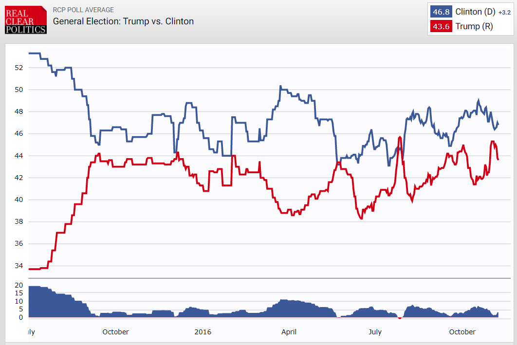 Усредненные результаты общенациональных опросов на 1 октября дают Байдену 50,1% голосов, Трампу — 42,9% (разница 7,2 п.п.). Четыре года назад за месяц до выборов 8 ноября Хиллари Клинтон тоже опережала Трампа по опросам, но разница была меньше — 3,2 п.п.